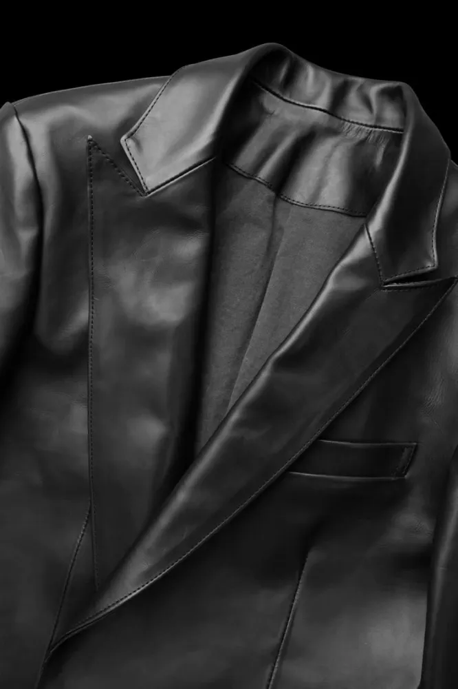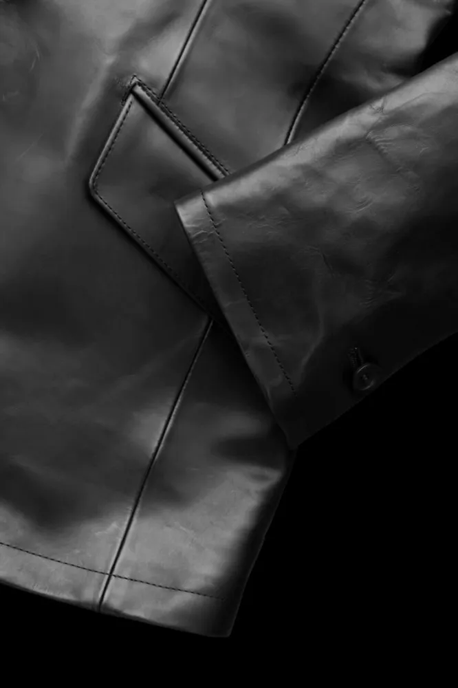 1B jacket maximizes its luxurious appeal with a beautiful silhouette, creating a statement piece. The waistline is contoured for a refined, sharp silhouette. This tailored jacket is free of shrinkage during production, allowing for a refined, smart silhouette with just the right amount of room for a comfortable fit. This simple 1B jacket is crafted from luxurious leather and features a simple, small peaked lapel, clearly showcasing the leather’s distinctive character. The body is lined with a newly developed urethane-blend stretch cotton, prioritizing durability and comfort, while the sleeves are lined with rayon for a smooth fit.