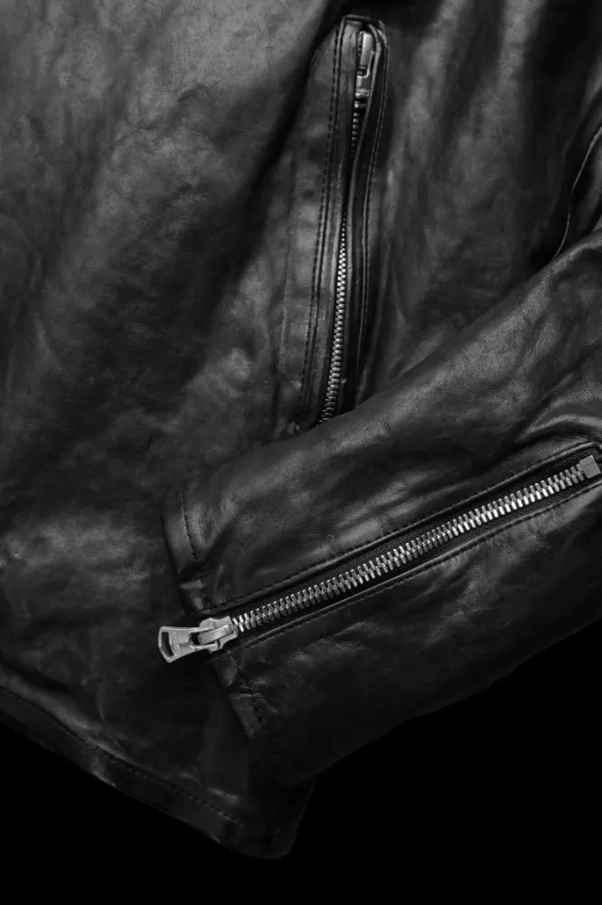 The base is made from 0.8-0.9mm thick tanned French double shoulder leather. The garment dyeing process uses a base that contains a lot of oil. The garment dyeing is performed at a lower intensity than the final color. The surface is then waxed and ironed to achieve a darker burnished finish. The uneven texture of the garment dyeing, with its shading, is enhanced by the wax burnishing process, resulting in a more sleek, well-toned, natural vintage look. This jacket exudes a unique presence, distinct from the Italian double shoulder garment-dyed series. Crafted from leather from the shoulder of an adult cow, it boasts a thick, solid, and rigid texture, but the oily texture of wax adds a supple, pull-up leather feel. The initial firmness and firmness gradually softens and develops a lustrous finish with repeated wear, deepening into a refined, refined look. This newly designed padded