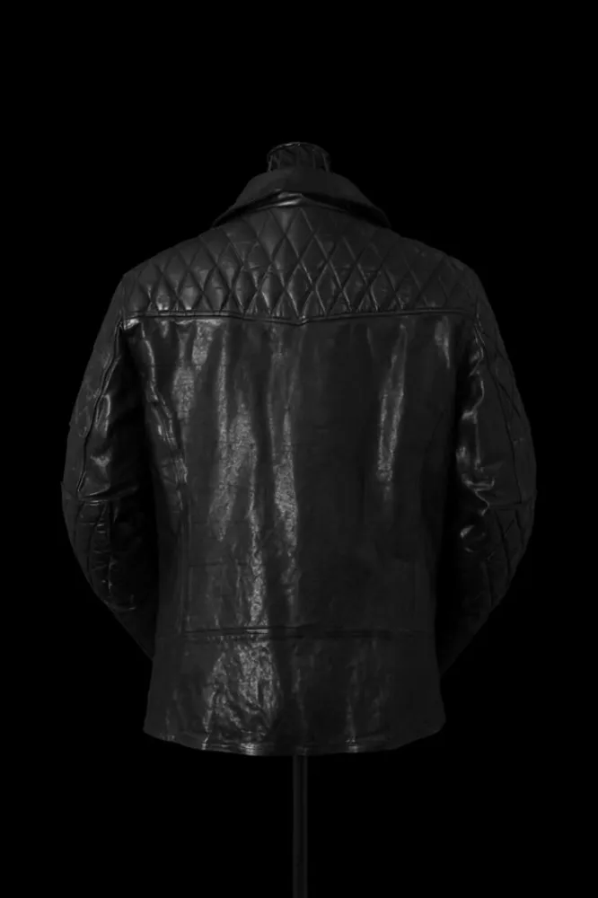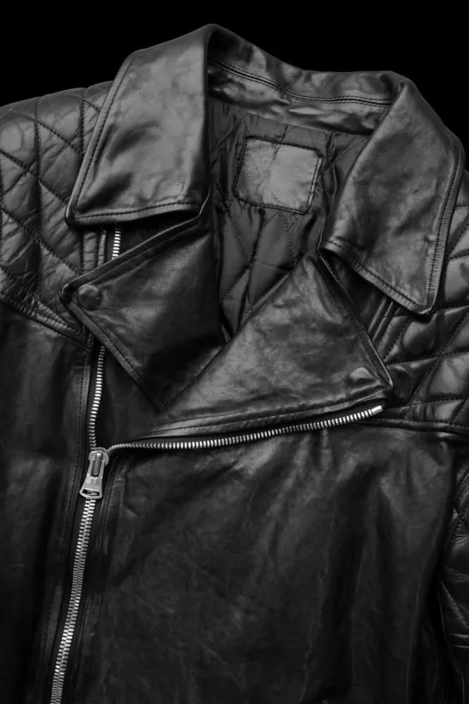 double rider jacket features continuous padding with soft, resilient urethane sponge inserted into the shoulders and elbows. The highly functional design, combined with the quilted lining, allows it to be worn as a winter rider jacket. The garment dyeing process is performed on both the padded and quilted lining, utilizing the techniques of our highly skilled in-house dyeing factory, resulting in a uniform, garment-dyed padded rider jacket with no discernible differences in the overall leather texture. The front and back feature diamond-patterned padding for a striking design, while the simple design eliminates the decorative elements typically found on double rider jackets. The zipper is a high-quality YKK zipper, designed to be both lightweight and comfortable. The entire zipper element has been meticulously polished, allowing for smooth opening and closing.