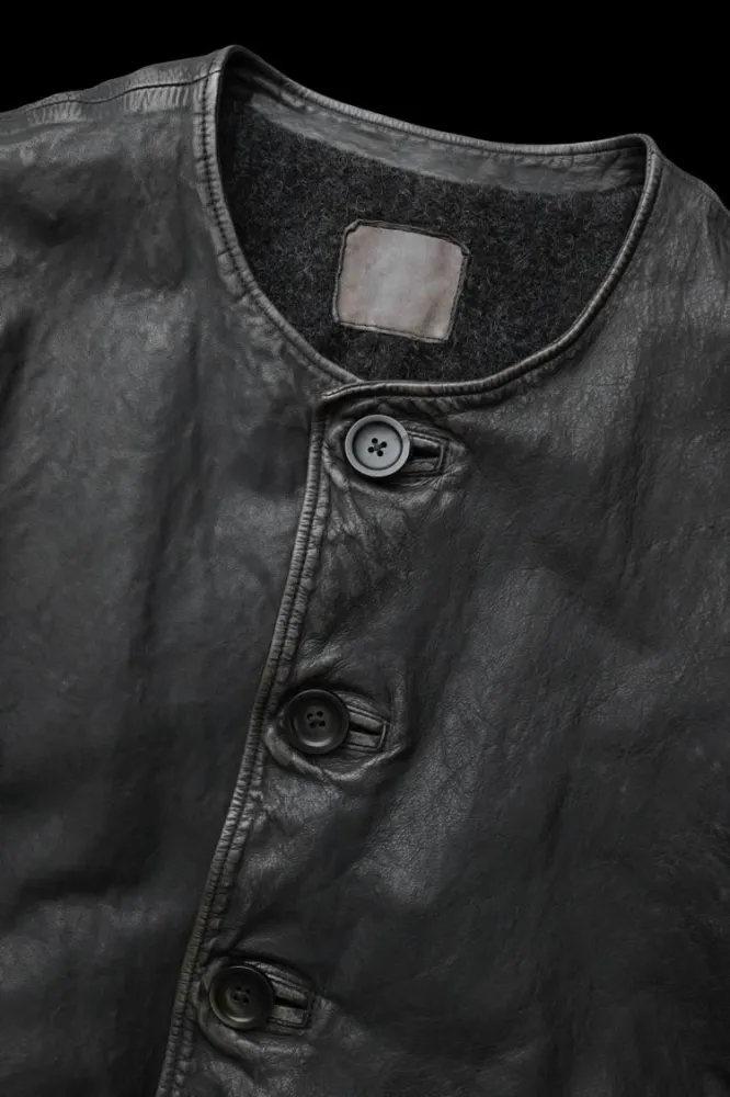 Taking advantage of the soft, light feel of the leather, the 0.8mm thick leather is used for this vest, designed for warmth and volume, ideal for adapting to the changing weather conditions of the autumn/winter season. The casual fit allows for a wide variety of innerwear, resulting in a relaxed leather vest. The