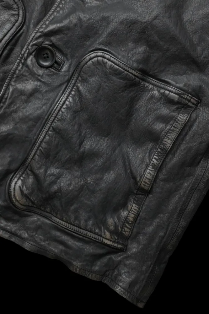 This bag features a base of high-quality leather tanned with white tannins. The leather is then further tanned with several vegetable tannins, including mimosa, in addition to oils, resulting in a supple texture not found in typical steer leather. This creates a silhouette without any stiffness or bulk. The extremely flexible base is then dyed in gray. Even after shrinkage, the finished product remains incredibly soft. After sizing, each piece is individually spray-dyed black, and then hand-shaved and wrinkled using a special liquid to create a realistic, distressed look. This new vintage process creates a truly vintage look. Using a base of leather rich in oil, this new technique creates a uniquely sophisticated finish.