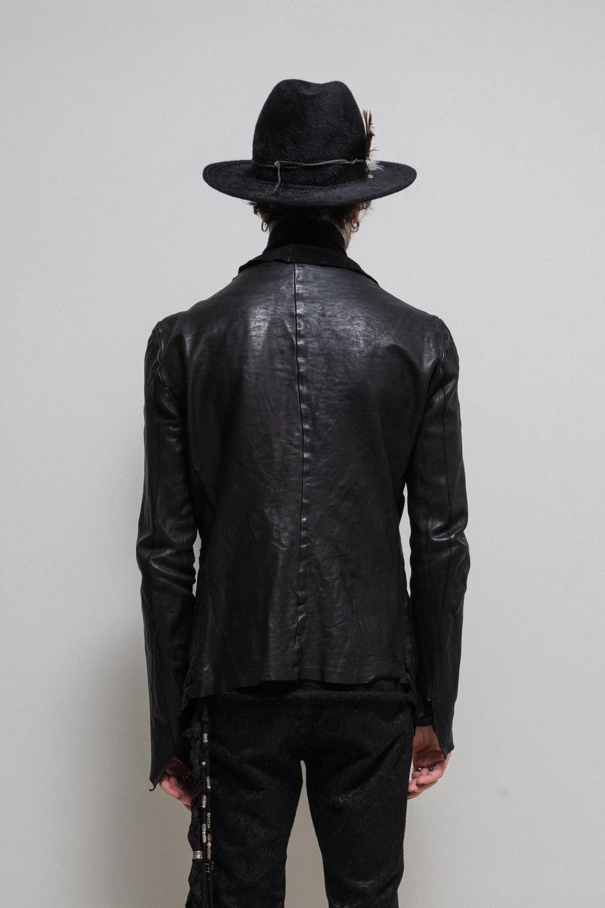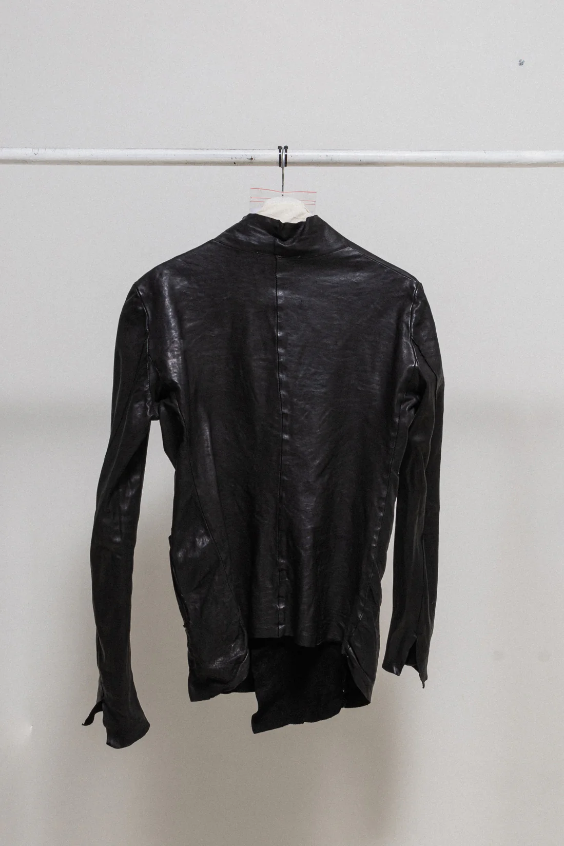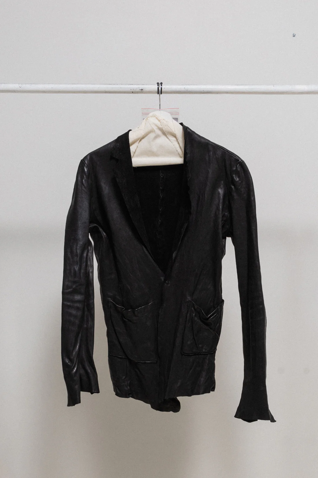 Amazing jacket made of a thick and rather stiff shell horse leather with a subtle sheen and creased texture as if it was slightly melted. Features raw edges and hems, two front patch pockets and a single snap button closure. Reversed lapels showing off the suede inner texture. Fitted cut.