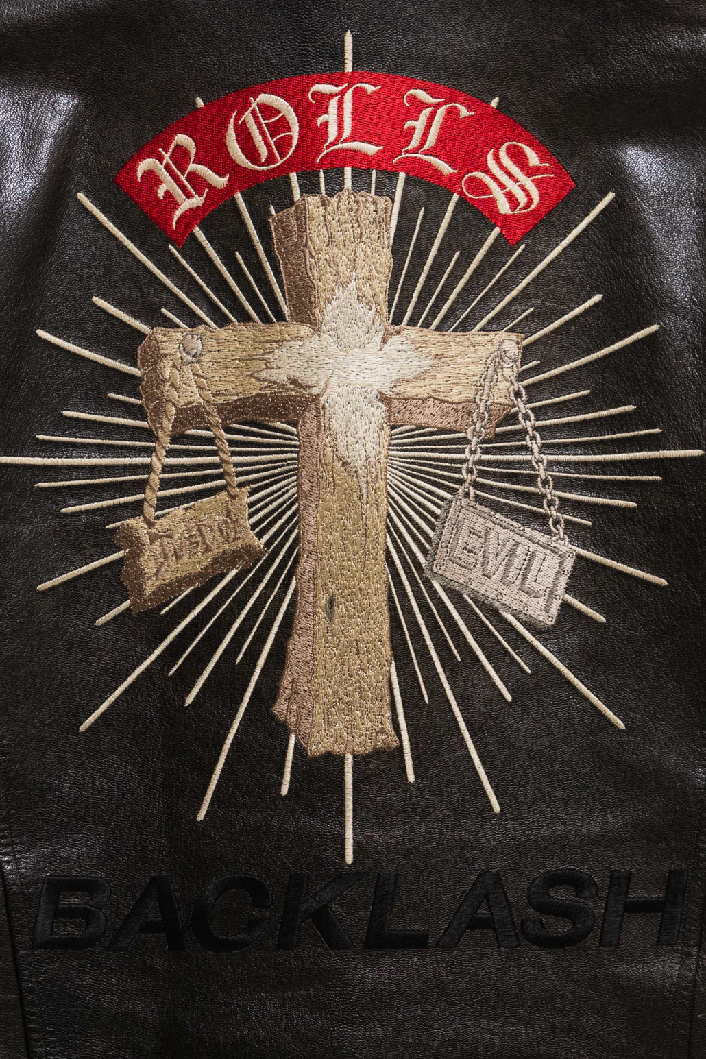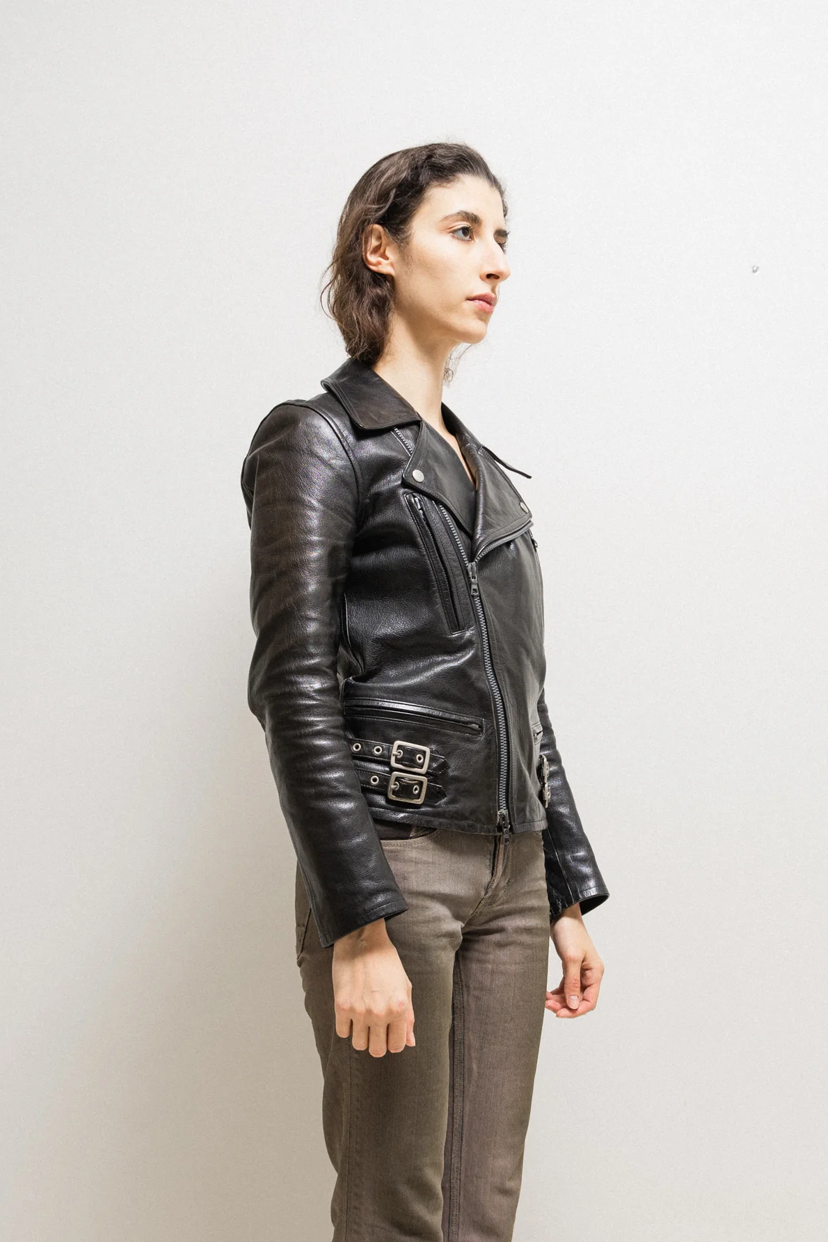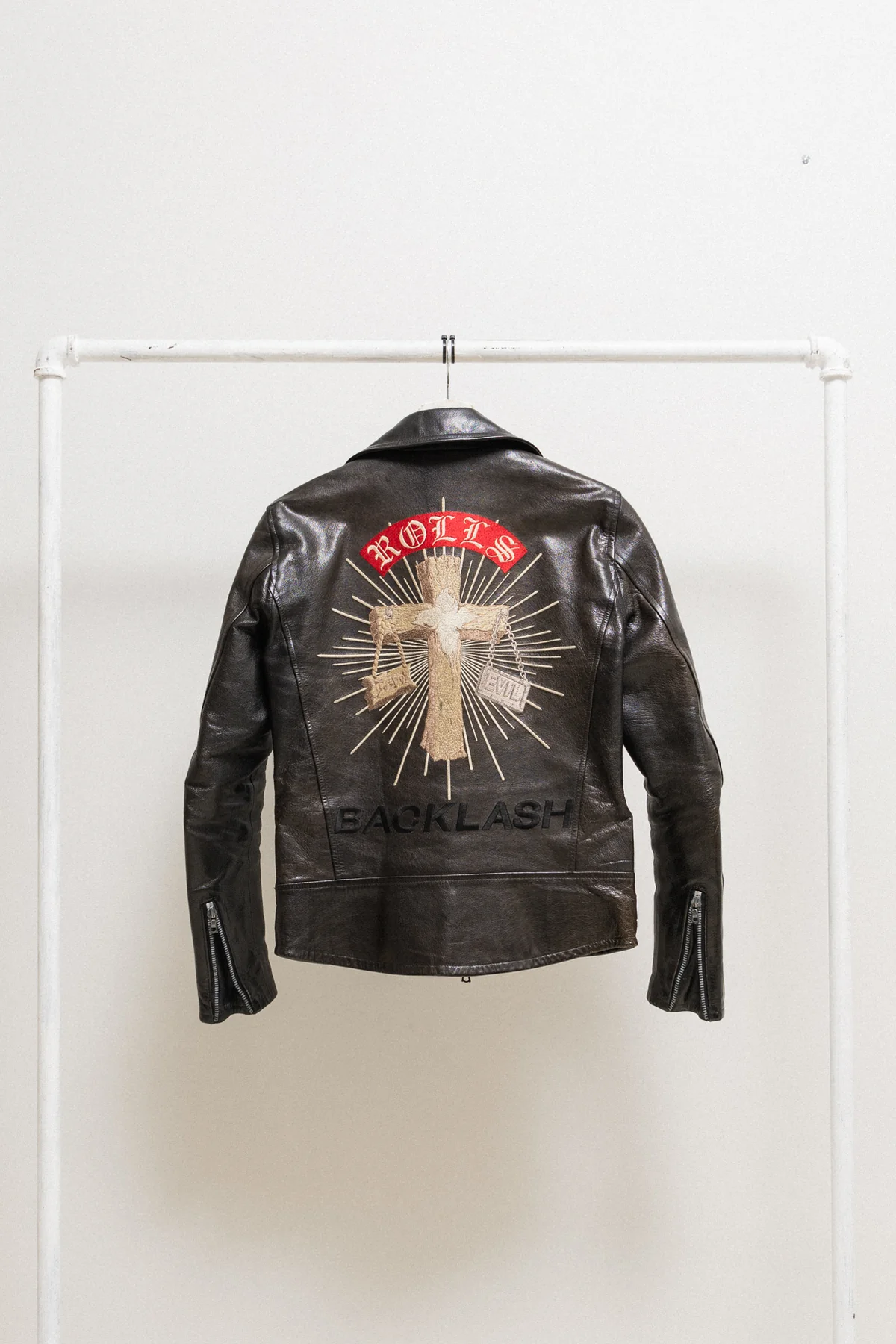 Wonderful perfecto jacket made of a thick and stiff goat leather with a very unique grain and shiny patina. Amazing embroidery covering the whole back, and beautiful construction with a strong silhouette and many details such as pleated sleeves, double side buckles, zipper pocket details, and a contrasting dark red lining.
