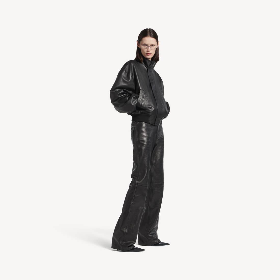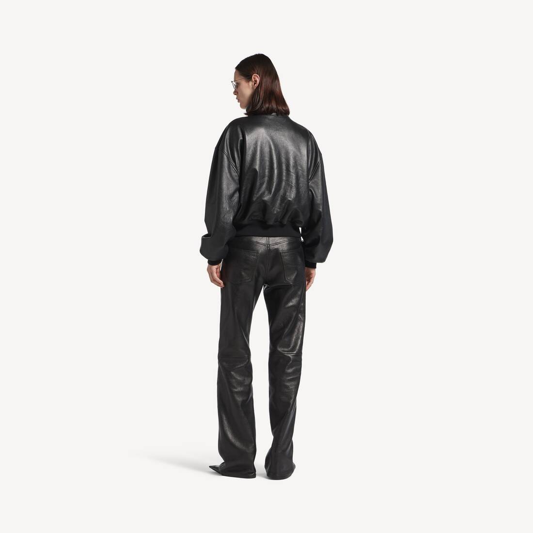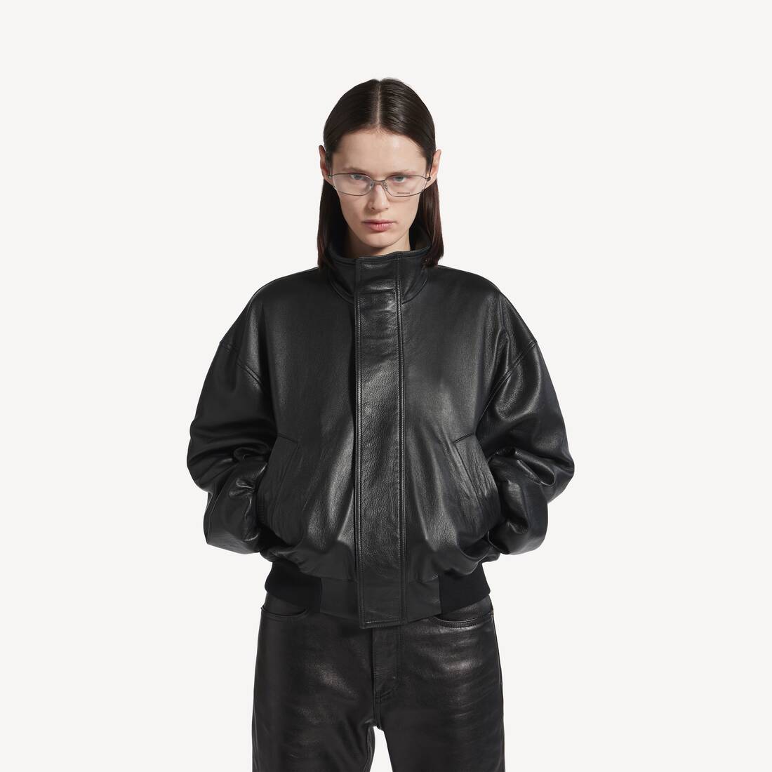Blouson in black smooth semi-shiny grainy leather for Women