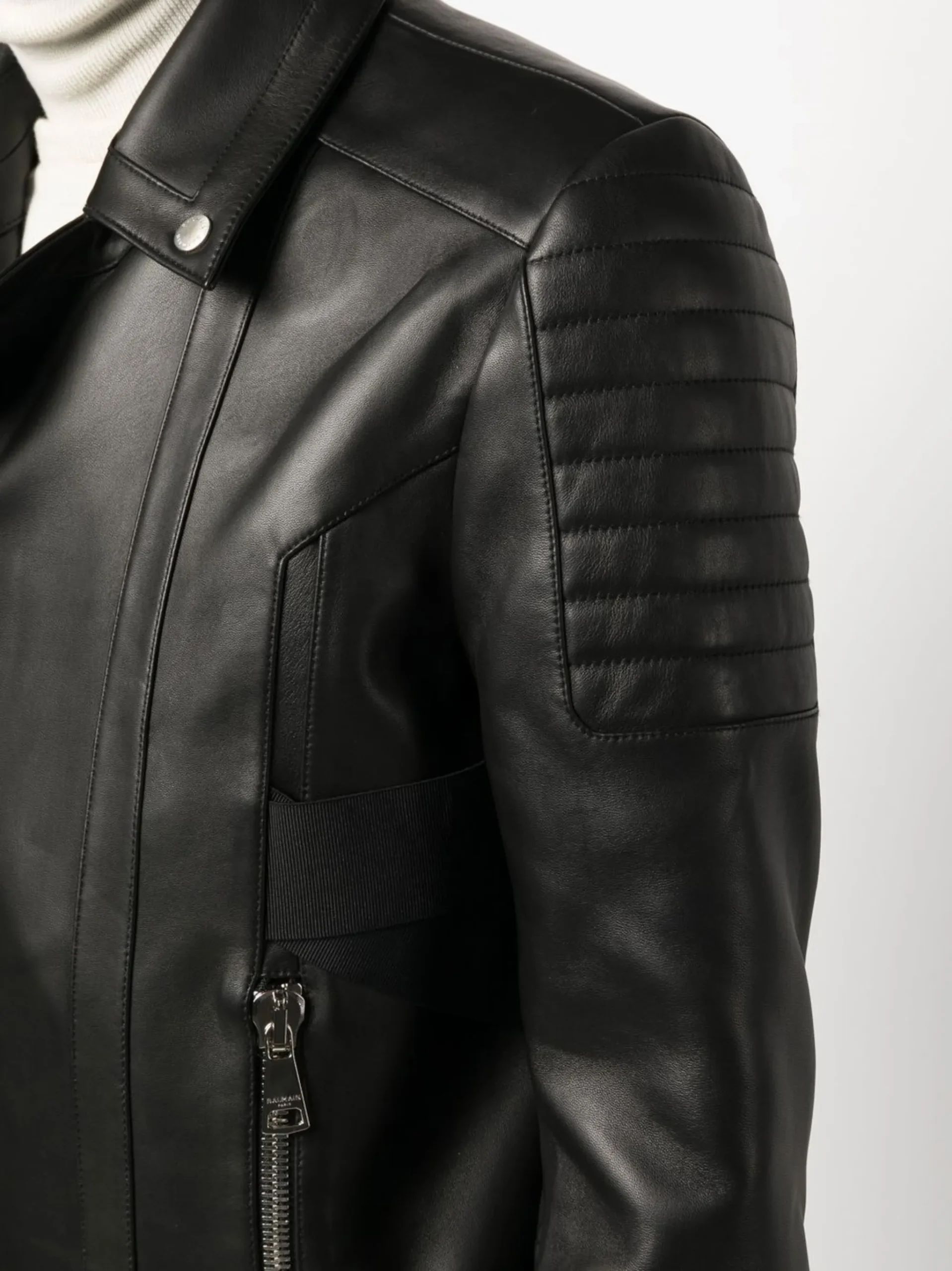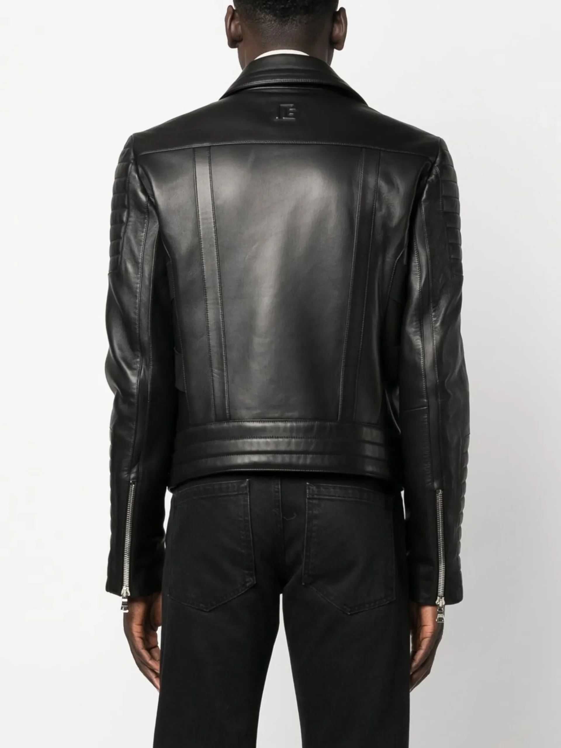 Balmain presents a classic biker jacket for AW22, crafted from smooth lambskin. The black-hued garment features silver-tone zip hardware and an embossed logo detail for a subtle brand touch.