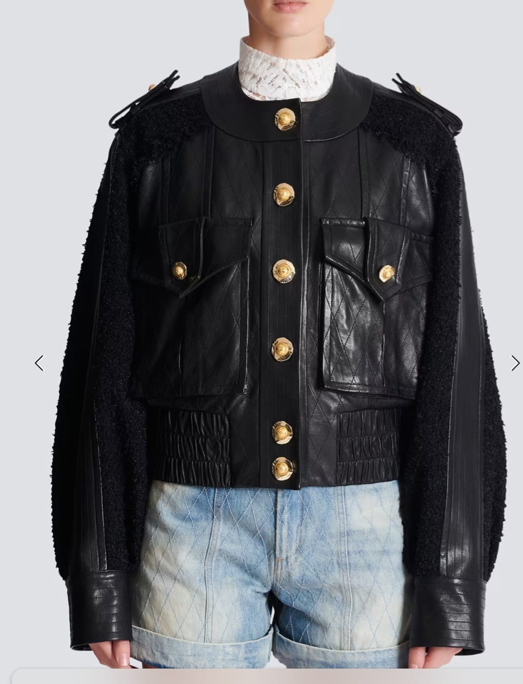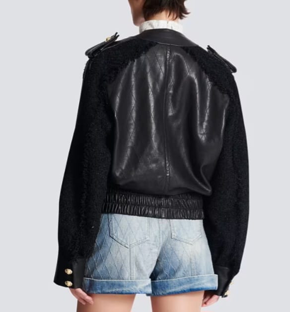Lambskin leather and tweed bomber jacket with topstitched Diamond pattern