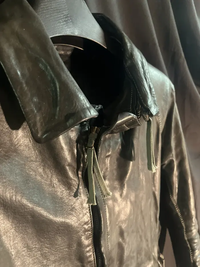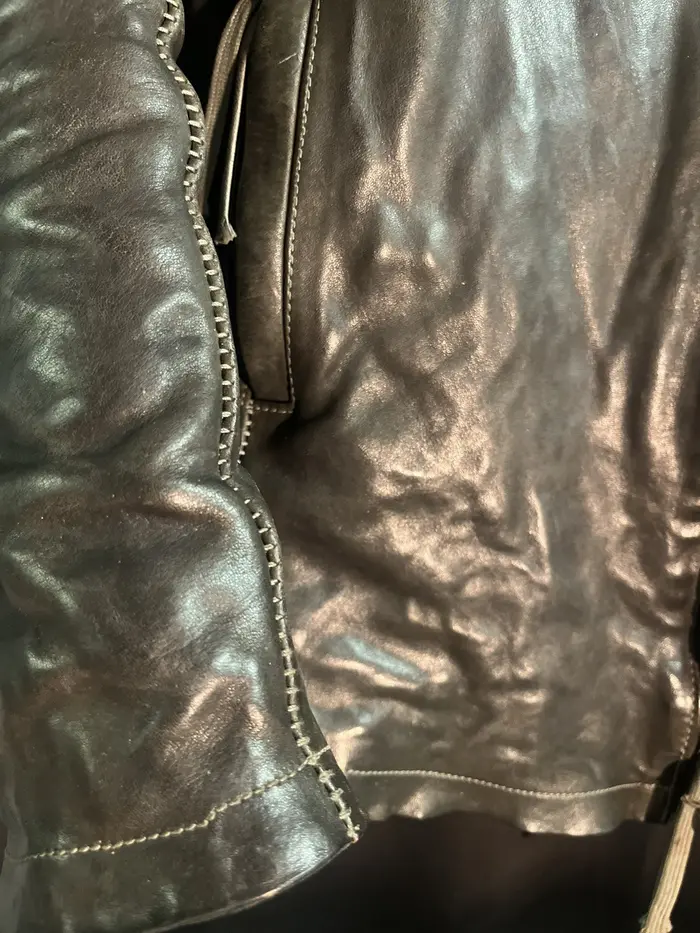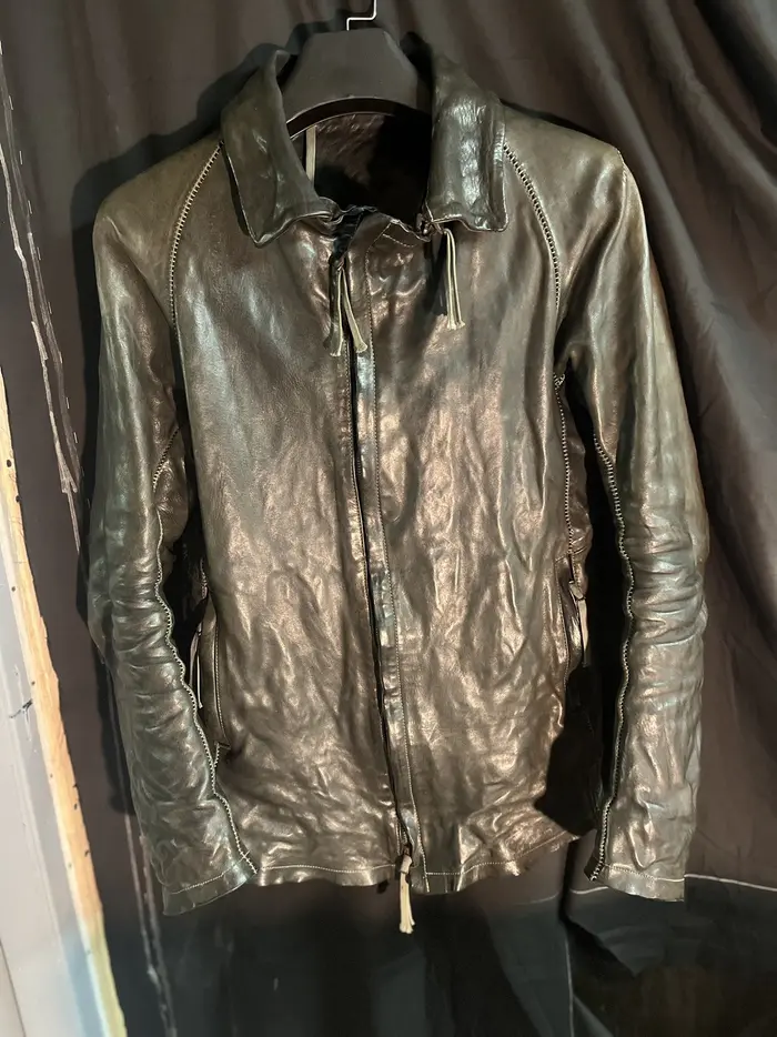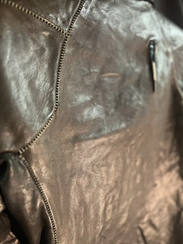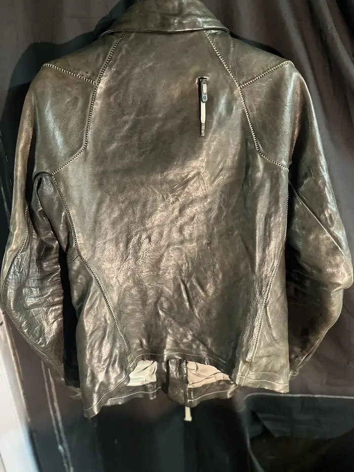 removable collar. Massive M8 riri 2 way zipper, color is wild a mix of greys. dyed leather