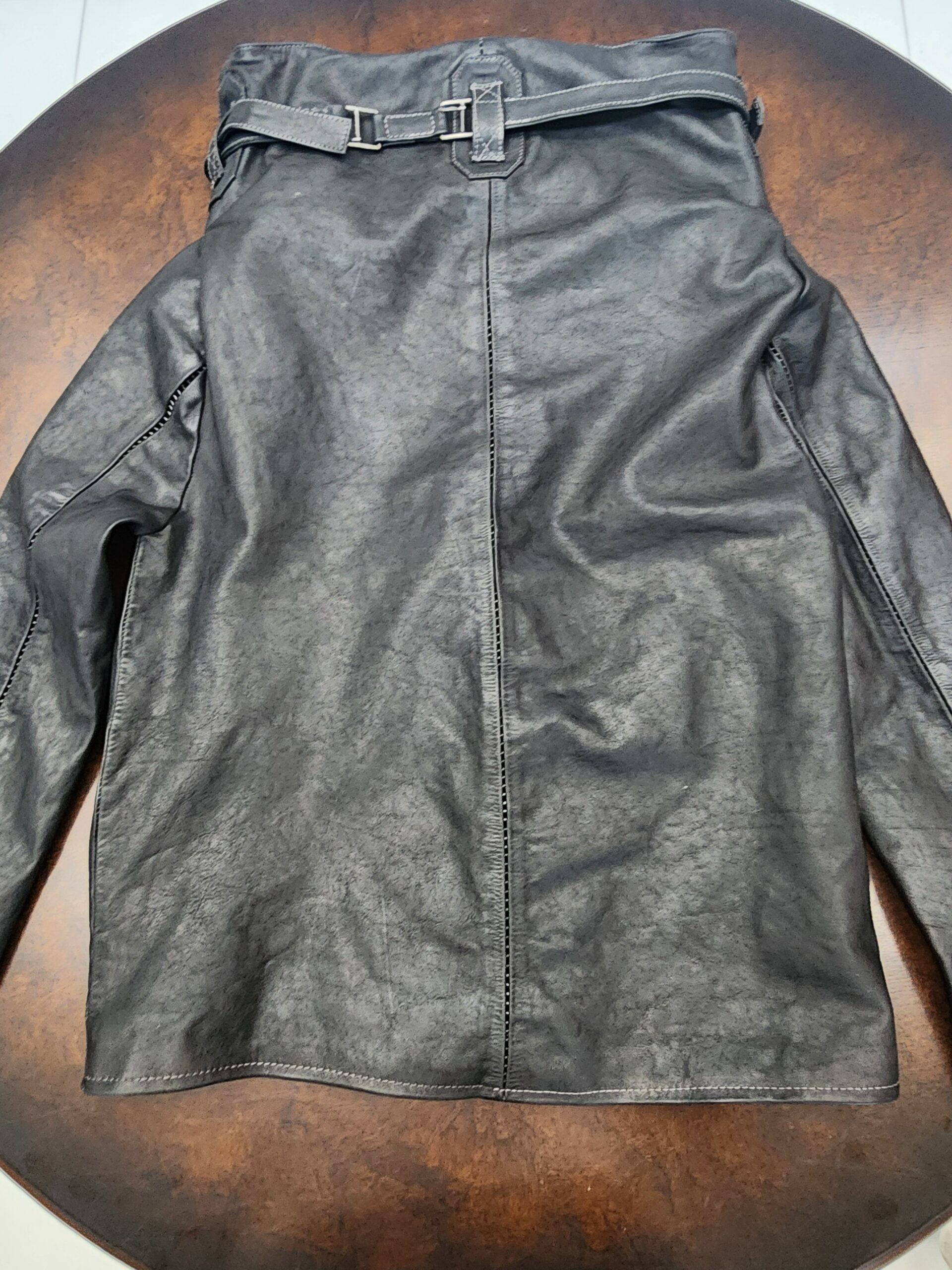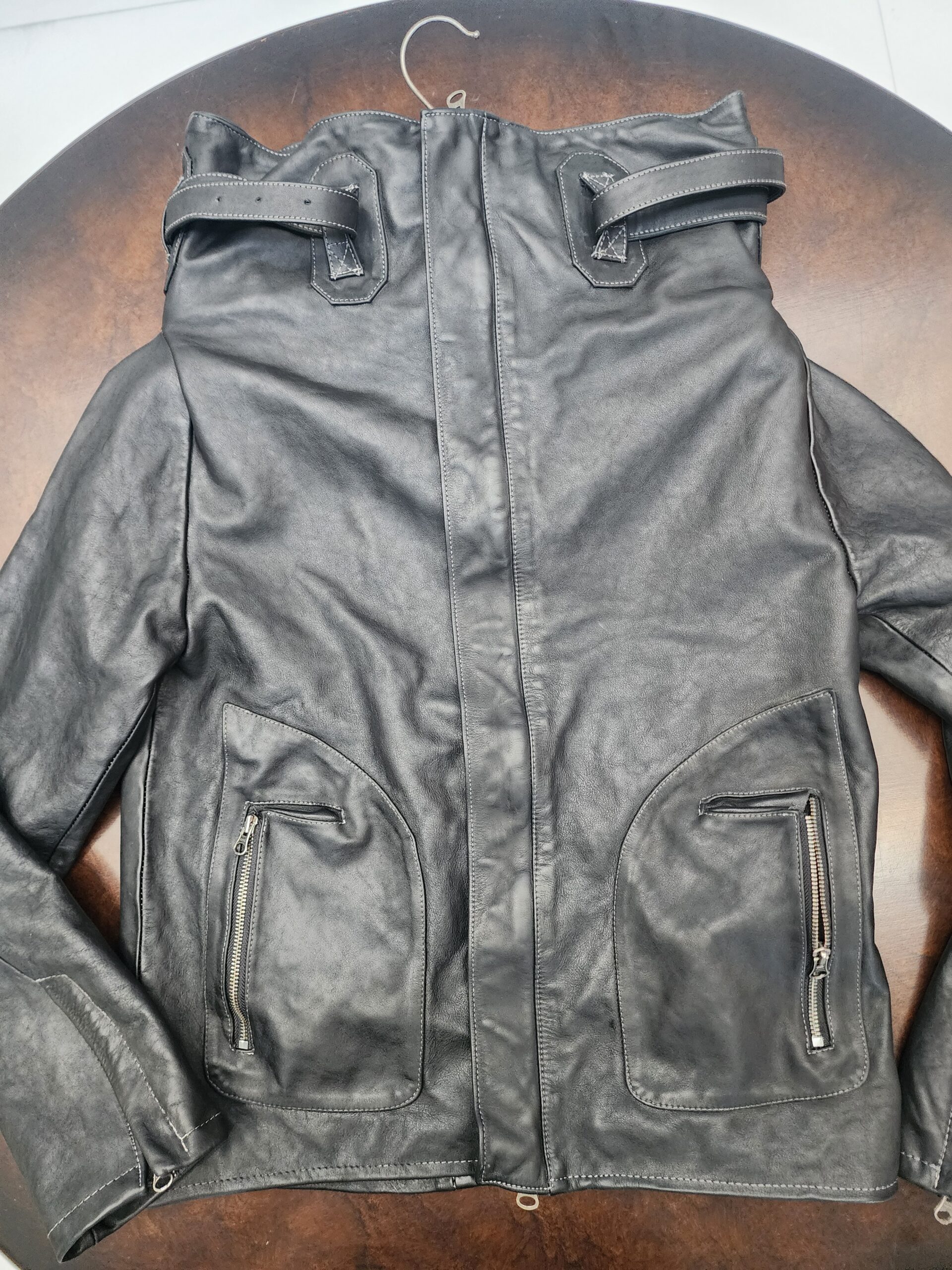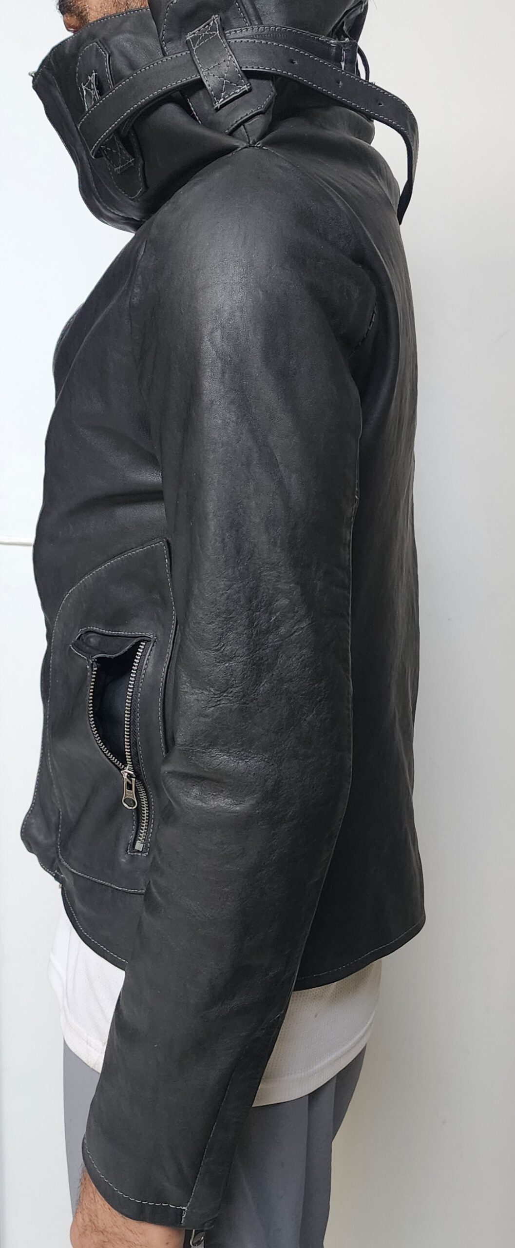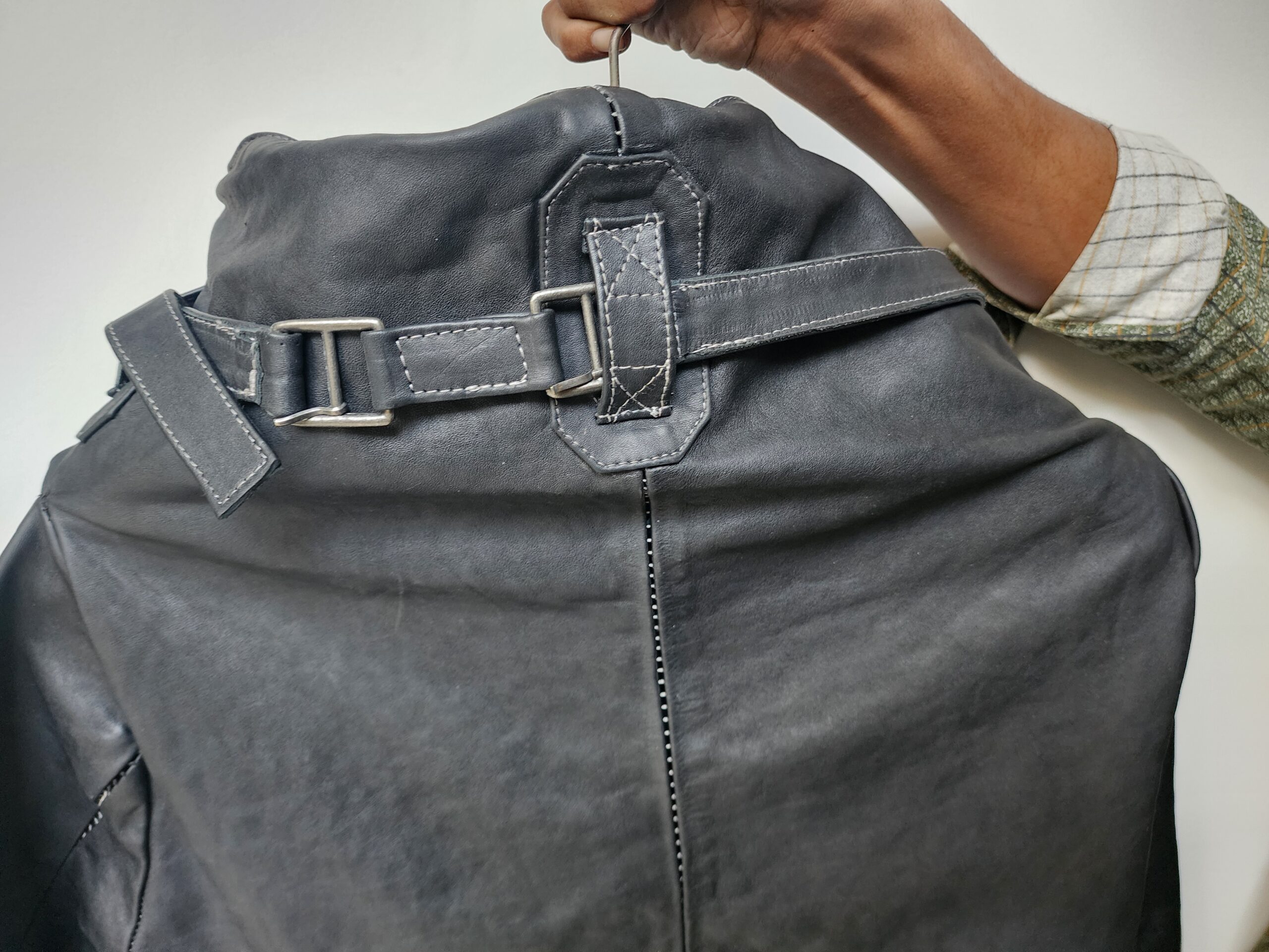 This high-collared jacket by Carol Christian Poell is crafted from the leather that has been treated so that it is very stiff and thick. It holds its form even when on the hanger, with the high-collar standing erect. The width of the collar is adjustable, with a strap running through 5 different loops. These loops are mirrored on the lining as well, but with no strap. There are adjustable sliders on the back of the neck. These details add interest and structure to the neck and shoulders. A hidden zipper runs the length of the jacket with twin zipper heads. There are also twin zipper closures on the cuffs and the side pockets. The side pockets have a stitching detail to highlight them, and a standing pleat to allow expansion. These pockets are mirrored on the inside, which also has two zipper pockets in the exact same place. The two seams on the arms and the rear centre seam are inside-out, with raw edges. This detail breaks up the smooth texture of the leather.