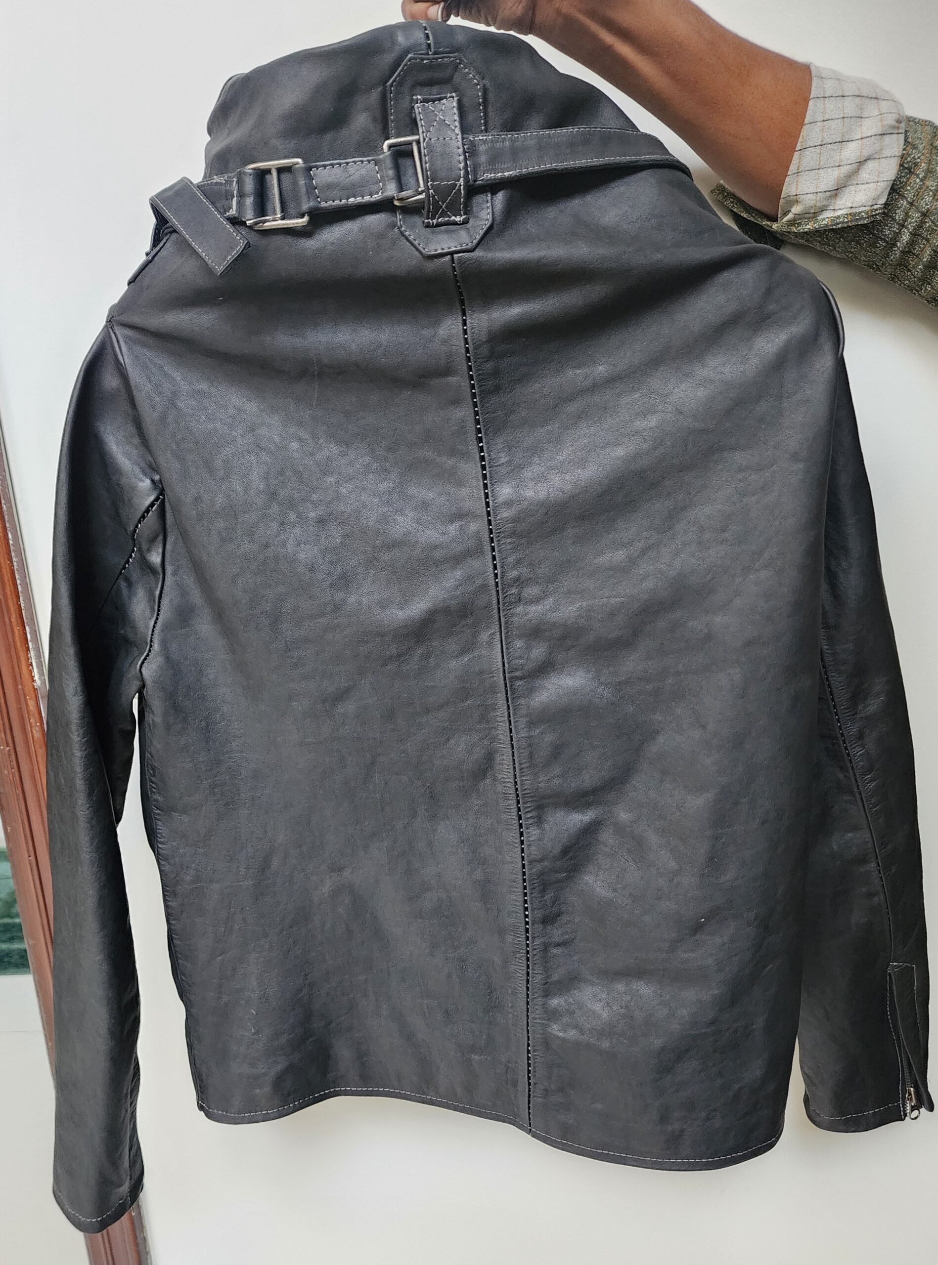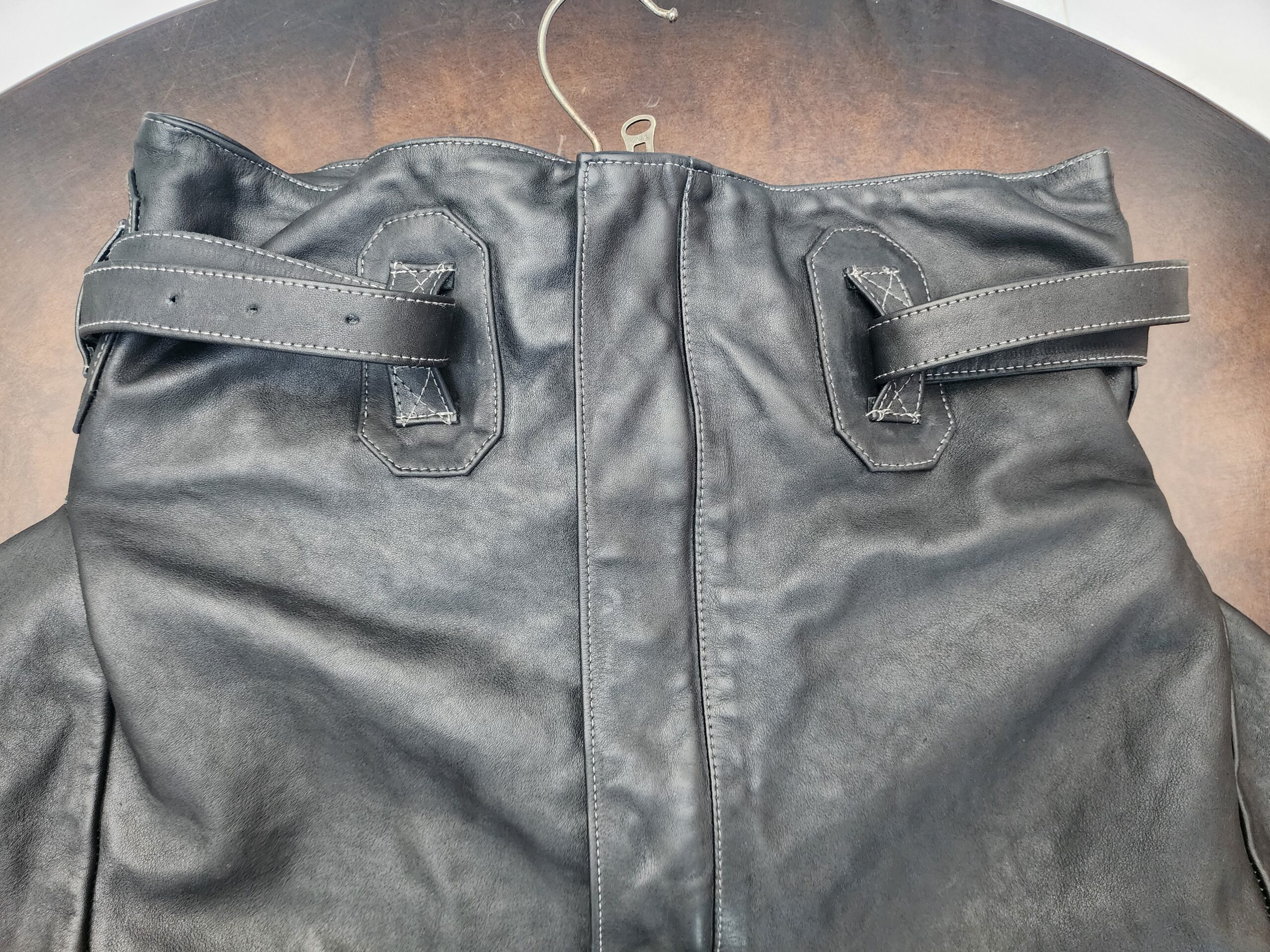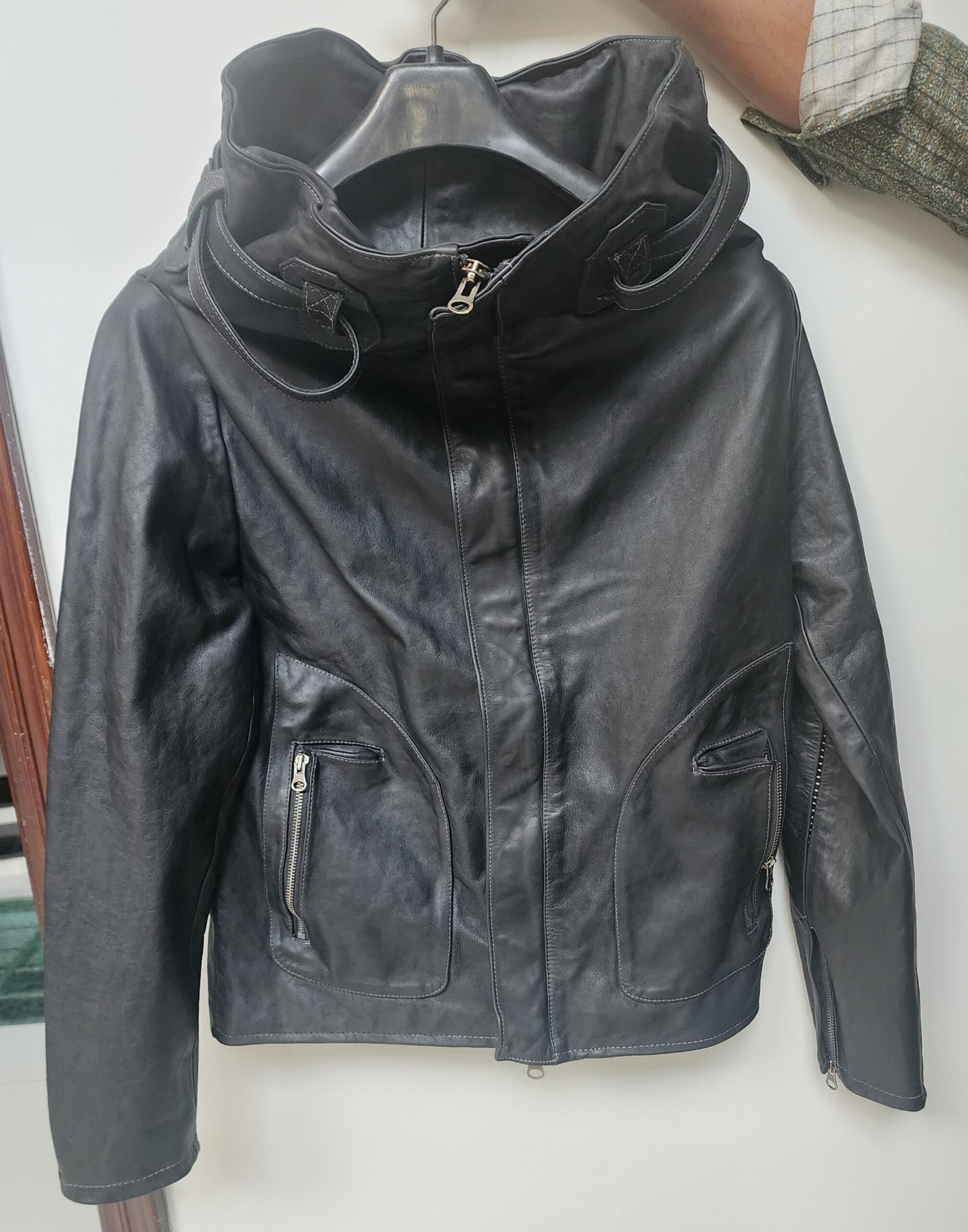 This high-collared jacket by Carol Christian Poell is crafted from the leather that has been treated so that it is very stiff and thick. It holds its form even when on the hanger, with the high-collar standing erect. The width of the collar is adjustable, with a strap running through 5 different loops. These loops are mirrored on the lining as well, but with no strap. There are adjustable sliders on the back of the neck. These details add interest and structure to the neck and shoulders. A hidden zipper runs the length of the jacket with twin zipper heads. There are also twin zipper closures on the cuffs and the side pockets. The side pockets have a stitching detail to highlight them, and a standing pleat to allow expansion. These pockets are mirrored on the inside, which also has two zipper pockets in the exact same place. The two seams on the arms and the rear centre seam are inside-out, with raw edges. This detail breaks up the smooth texture of the leather.