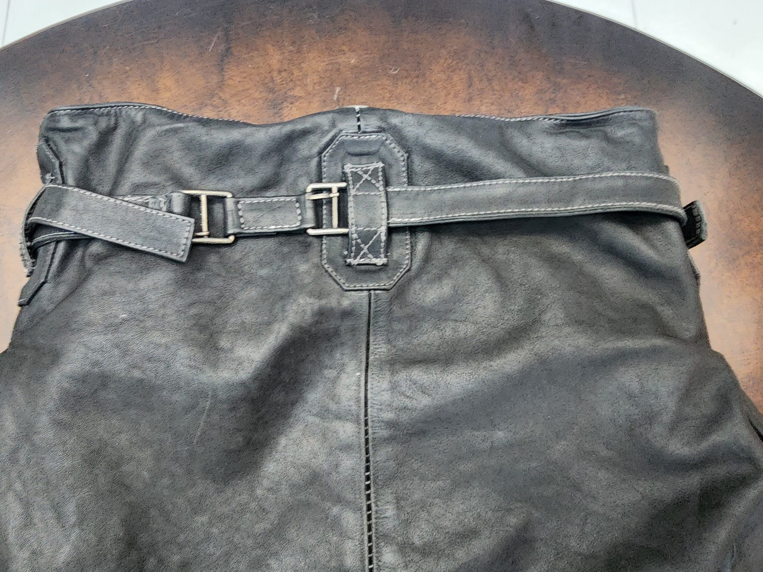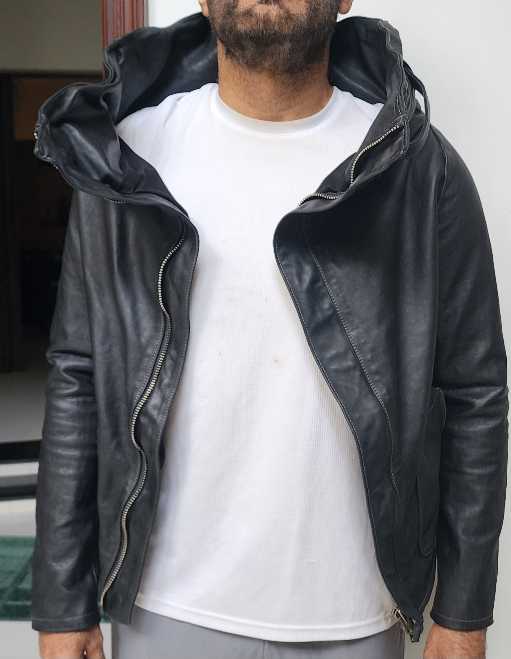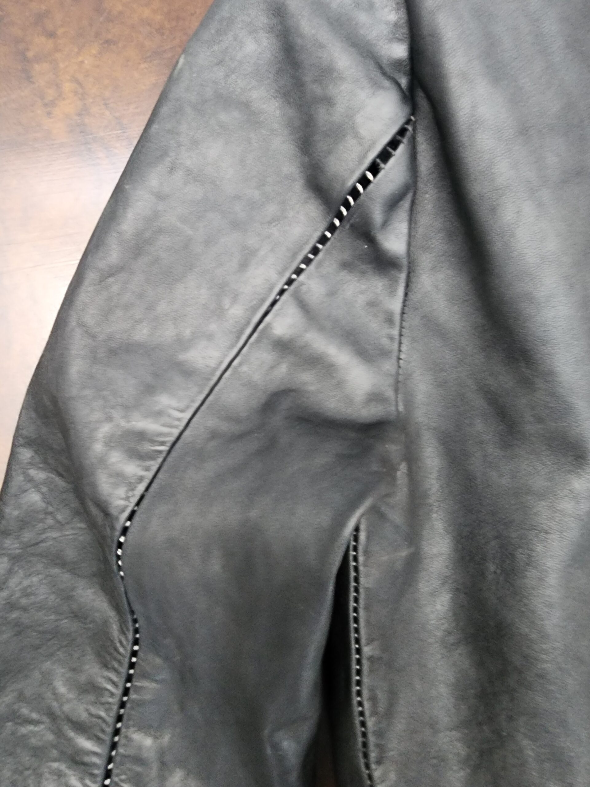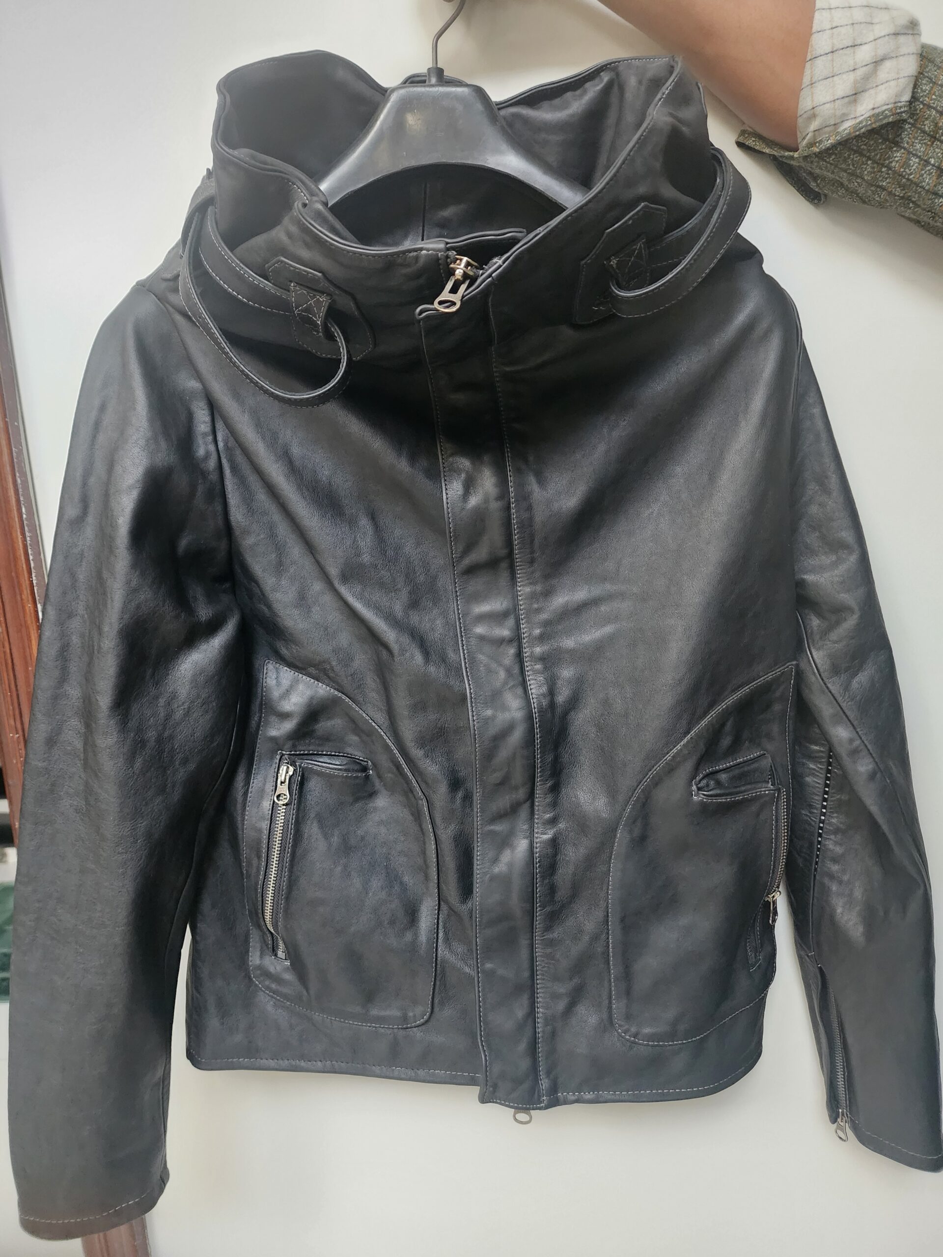 This high-collared jacket by Carol Christian Poell is crafted from the leather that has been treated so that it is very stiff and thick. It holds its form even when on the hanger, with the high-collar standing erect. The width of the collar is adjustable, with a strap running through 5 different loops. These loops are mirrored on the lining as well, but with no strap. There are adjustable sliders on the back of the neck. These details add interest and structure to the neck and shoulders. A hidden zipper runs the length of the jacket with twin zipper heads. There are also twin zipper closures on the cuffs and the side pockets. The side pockets have a stitching detail to highlight them, and a standing pleat to allow expansion. These pockets are mirrored on the inside, which also has two zipper pockets in the exact same place. The two seams on the arms and the rear centre seam are inside-out, with raw edges. This detail breaks up the smooth texture of the leather.