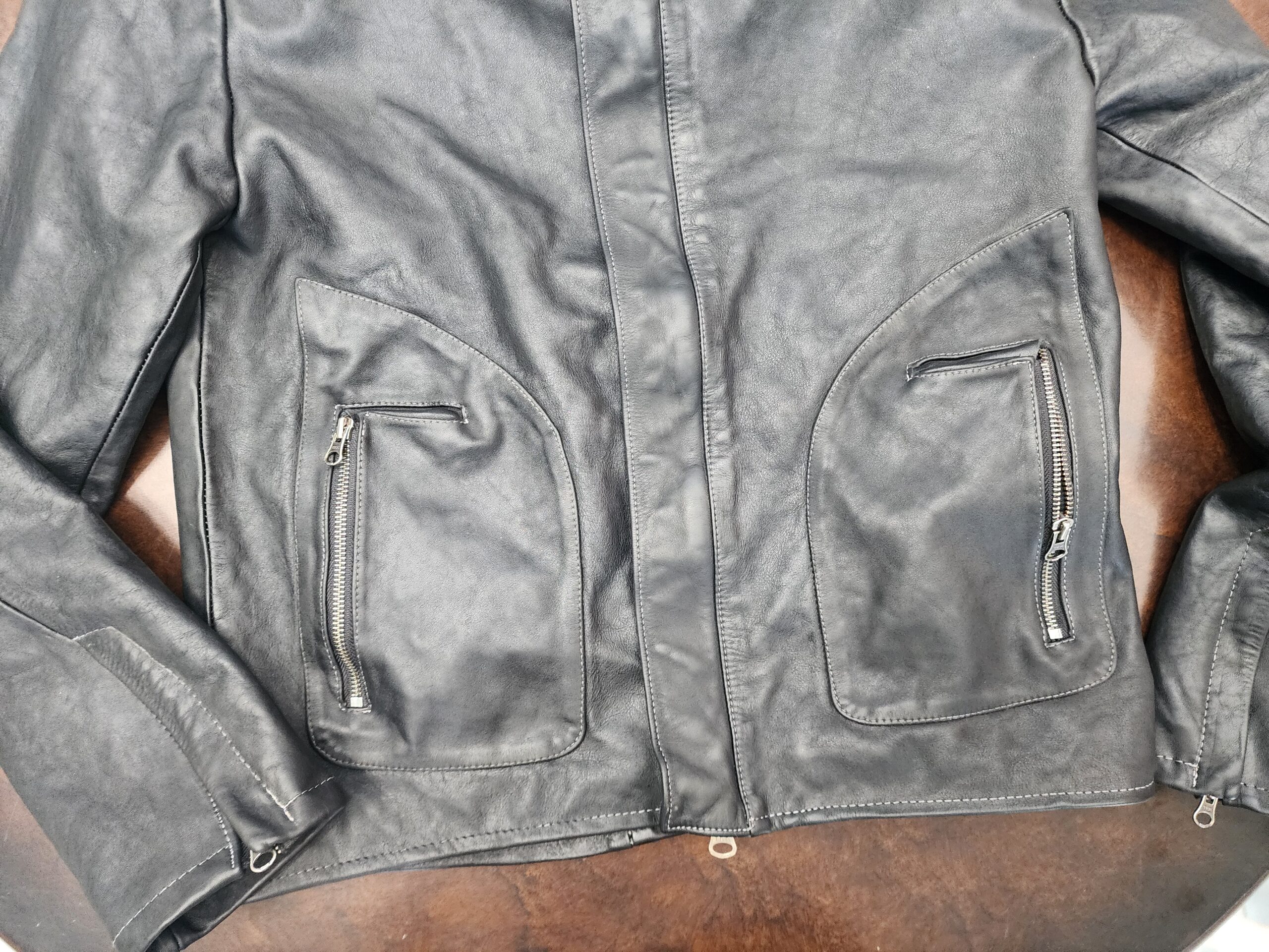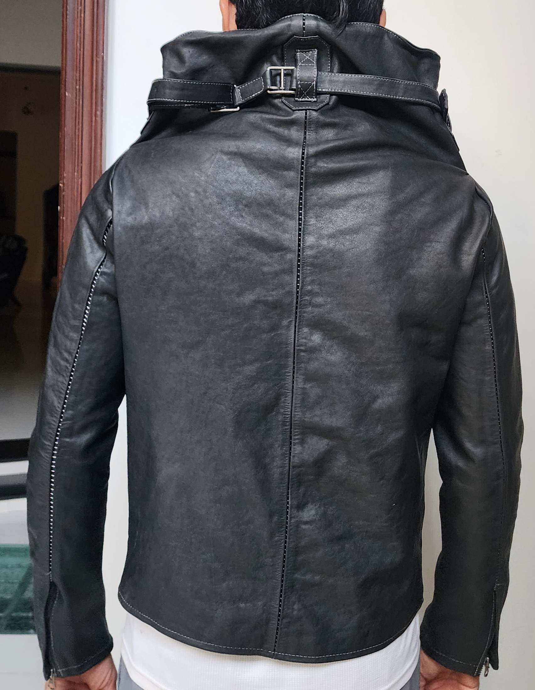 The jacket is made with perfection in details and in a very high quality 100% thick CALFSKIN WASHED with exact look as in the picture. It is available in Black, email us for any other color you would like.