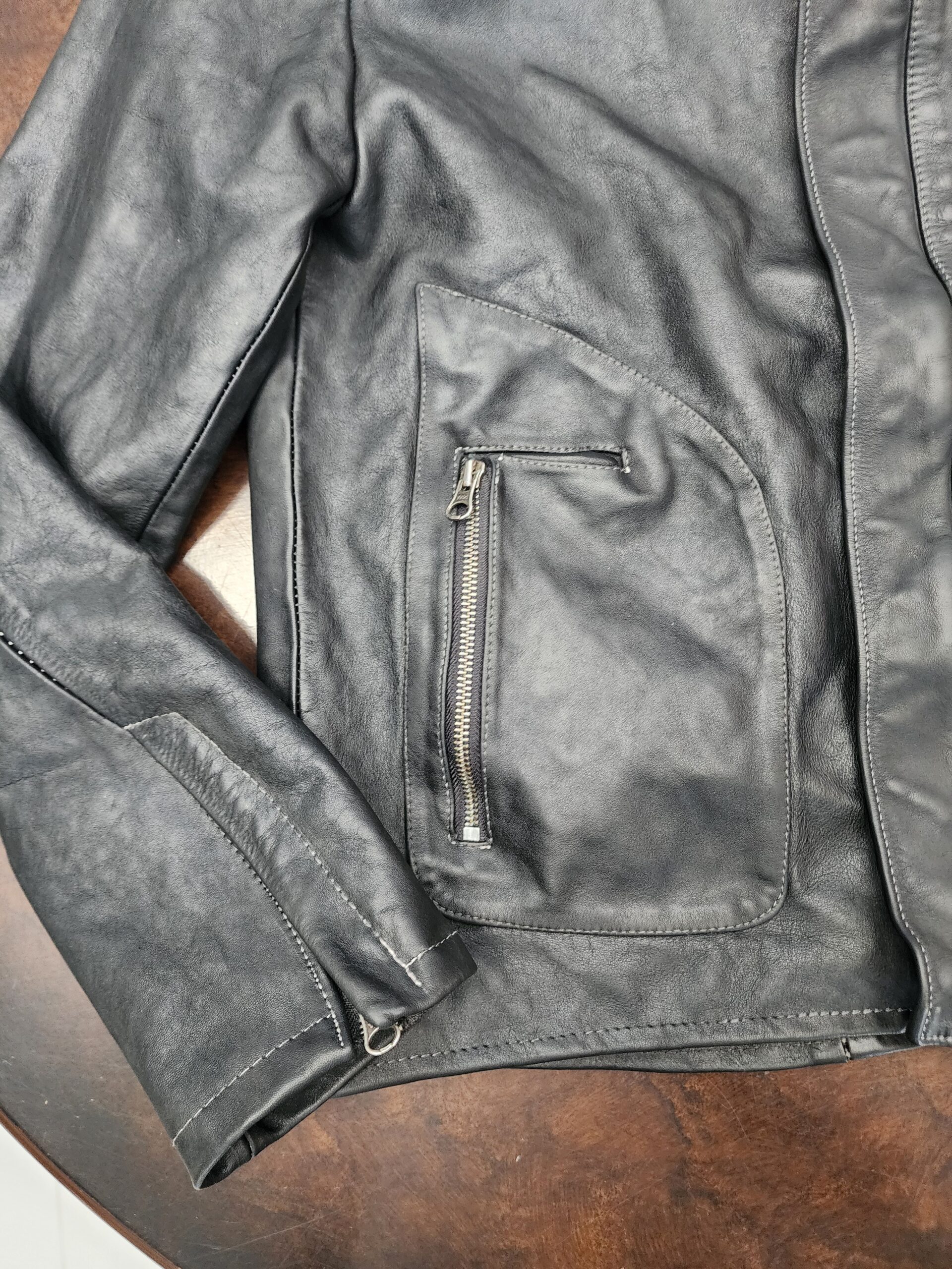 This is the perfect reproduction jacket fully lined, slim fitted biker jacket zip front, pocket details.