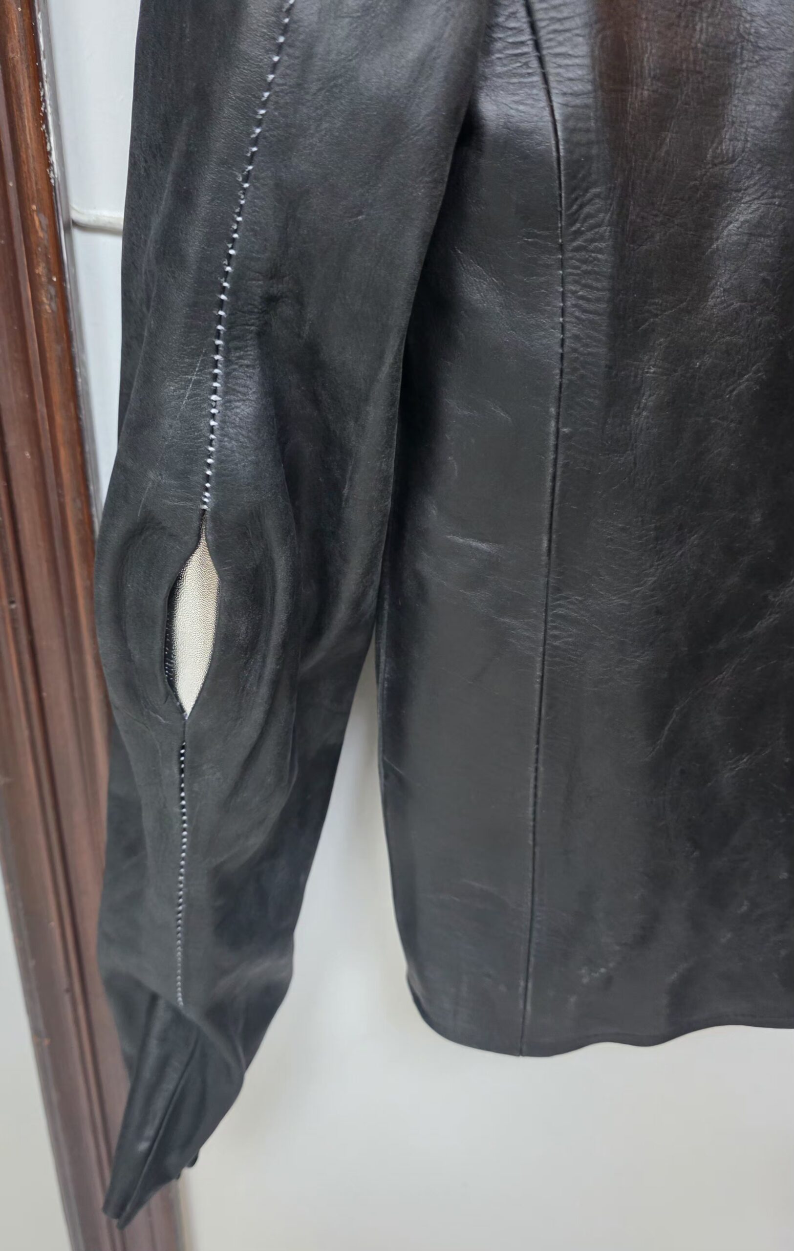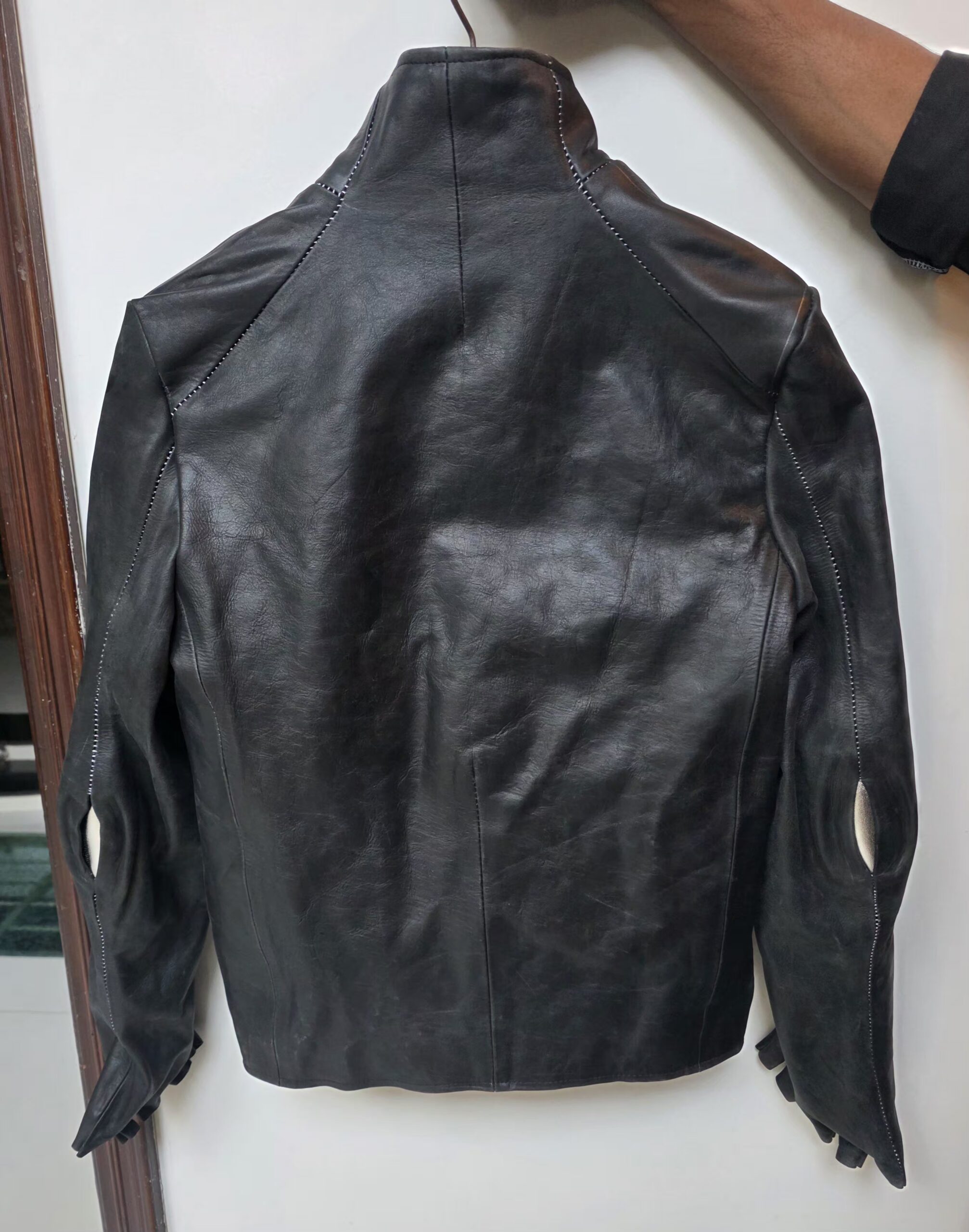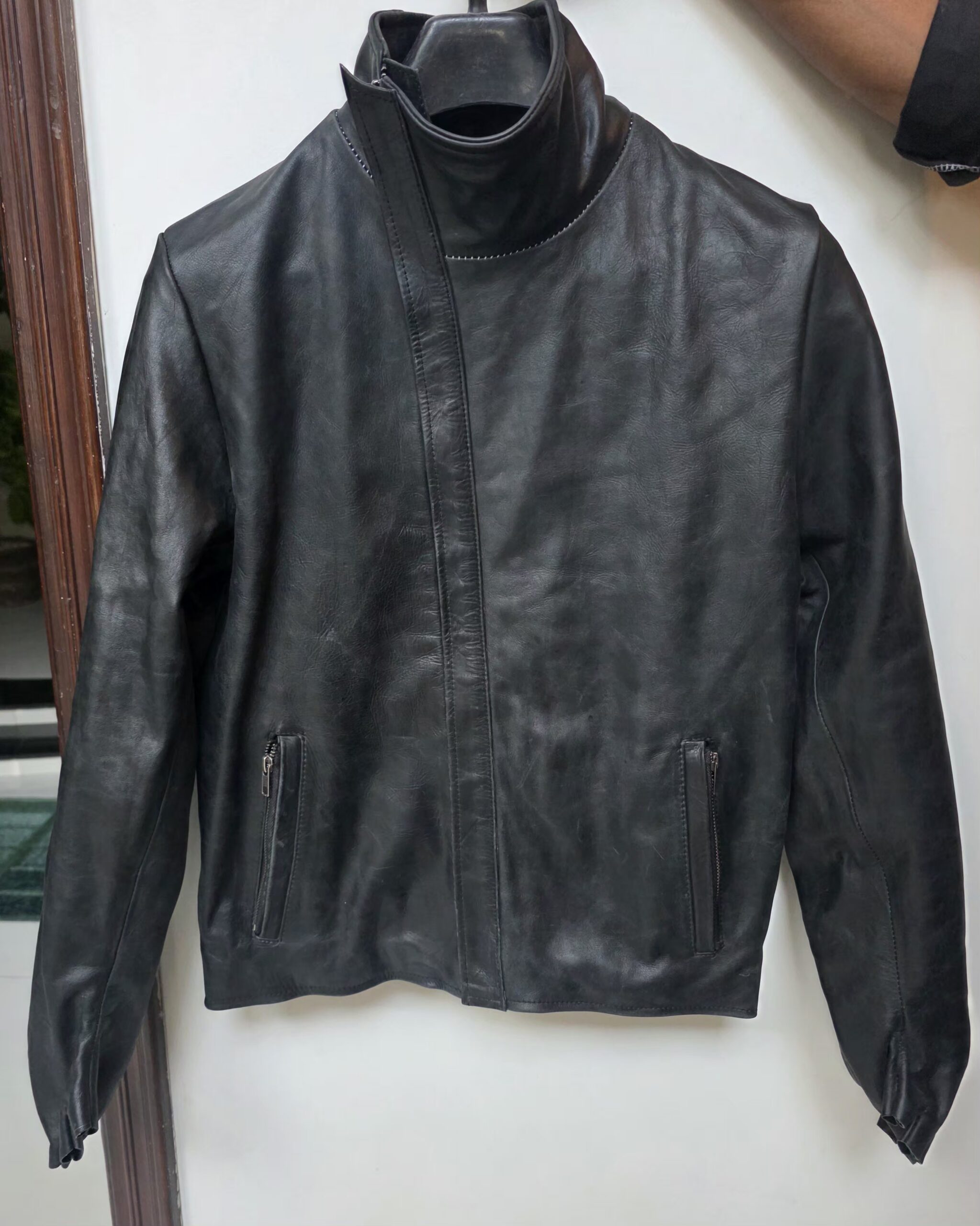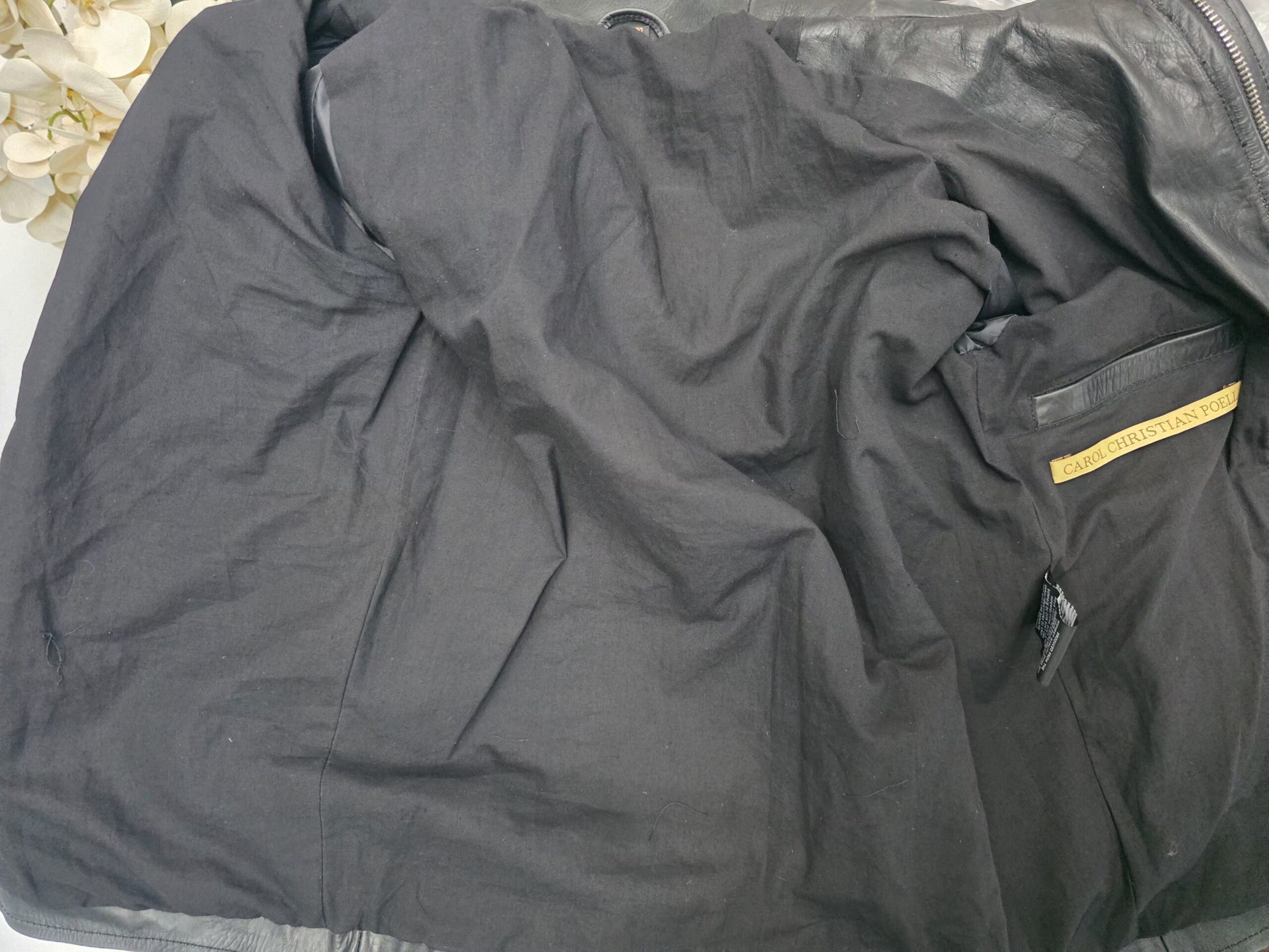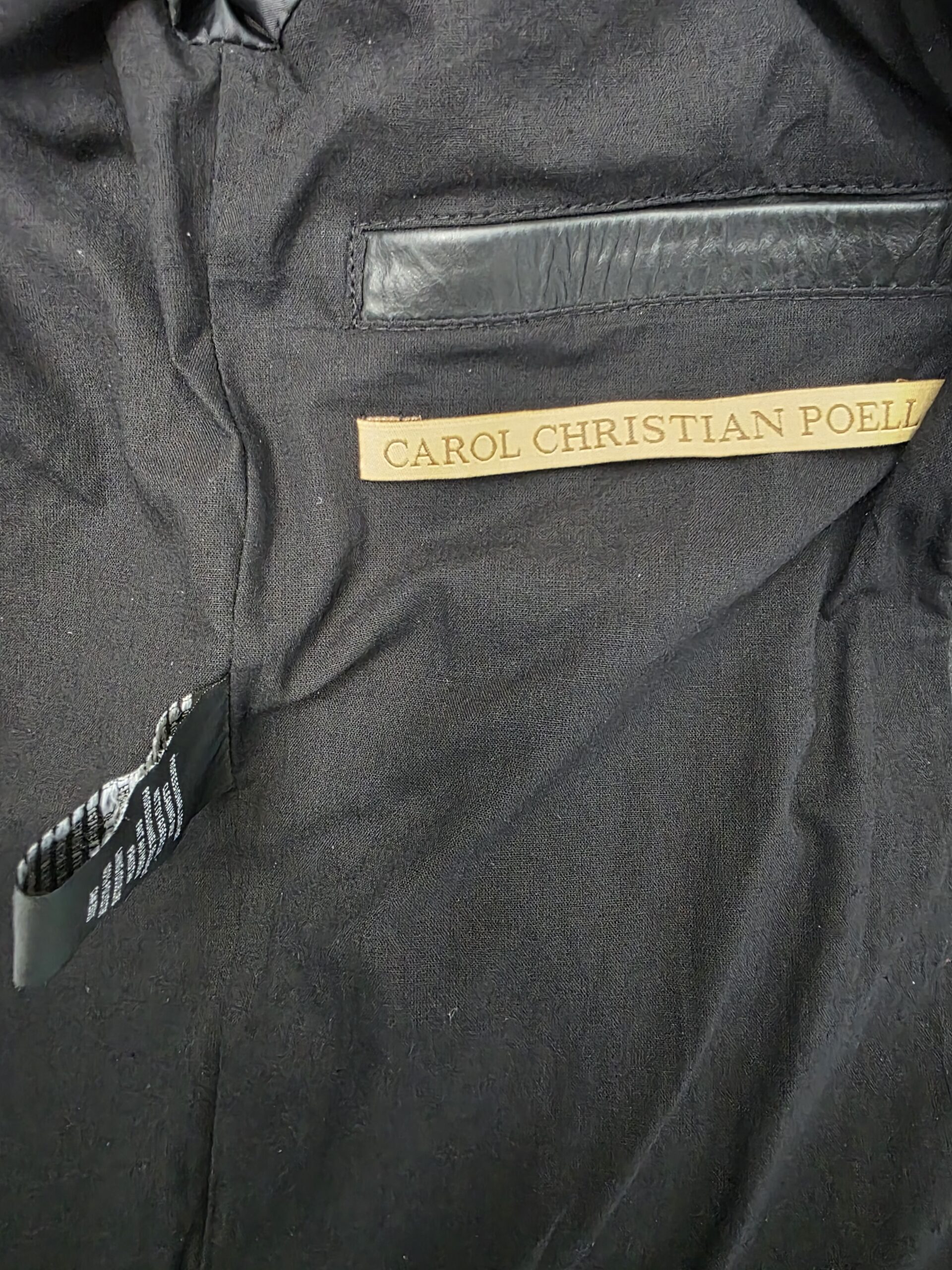 The Object Dyed Spine Elbow and Hand Leather Jacket, model LM/2599G-SP, exemplifies Carol Christian Poell’s commitment to innovative design and meticulous craftsmanship. Crafted from 100% horse leather (CORS-PTC), this jacket boasts a rich grey hue achieved through a unique object dyeing process, enhancing the natural texture and depth of the leather.