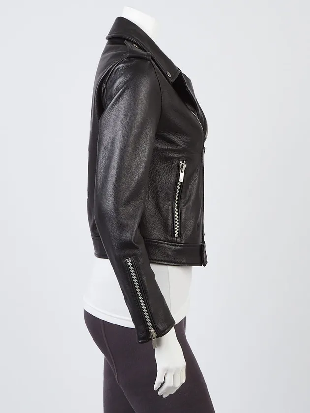 This stunning leather jacket is Dior’s rendition of the classic motorcycle jacket. This leather jacket has antiqued silvertone hardware with round studded detailing on the front zip pockets and shoulder epaulets with an asymmetrical zip front.?The back features a printed image of a skeleton and snake for an edgy look.
