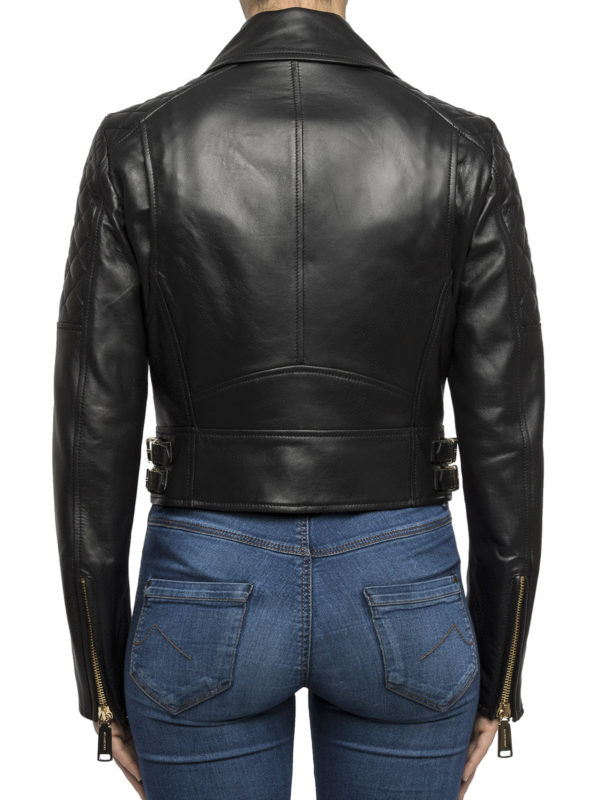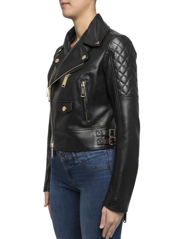 Leather biker cropped jacket featuring long sleeves, lapel collar, gold-tone zipped off-centre fastening, zipped front pockets and cuffs.