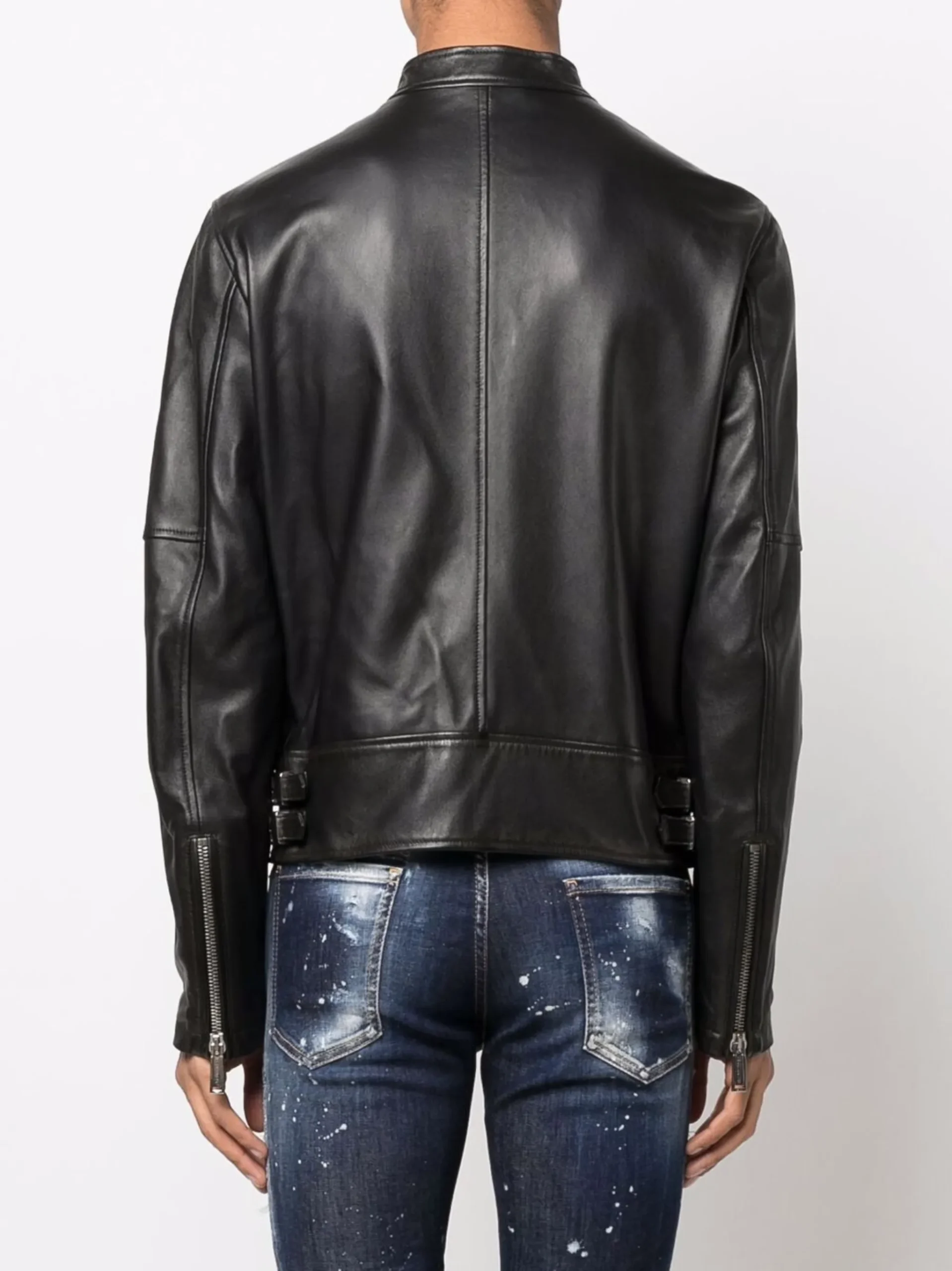 black lambskin front two-way zip fastening band collar two zip-fastening pockets cuff zips long sleeves straight hem
