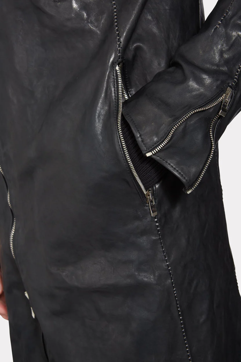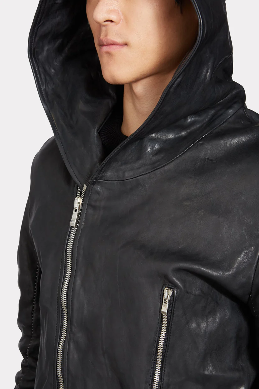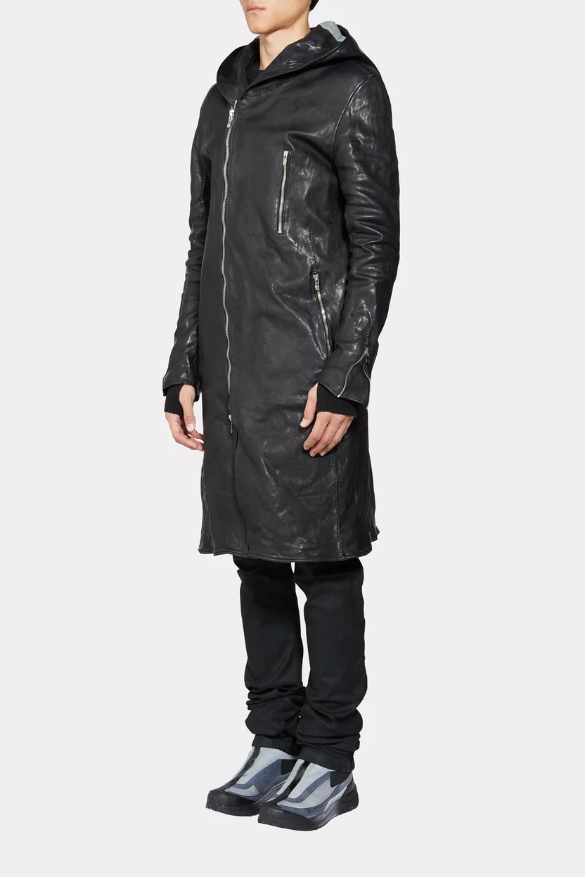 Black Hooded Calf Leather Coat from Incarnation, featuring with off-centered zip closure, front pockets with zip closures, slits on sleeve hems with zips, designer’s signature overlock stitching, slit at back.