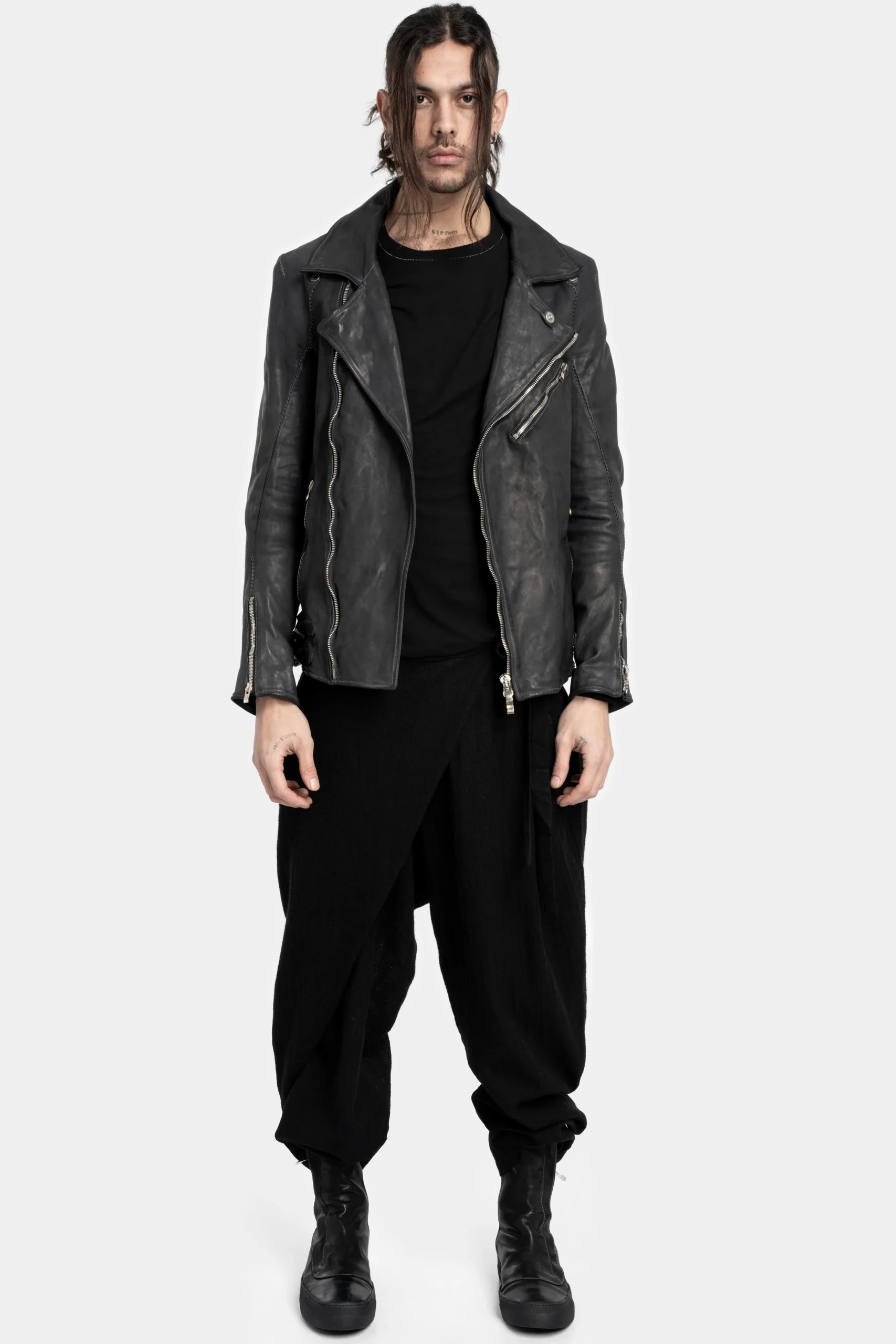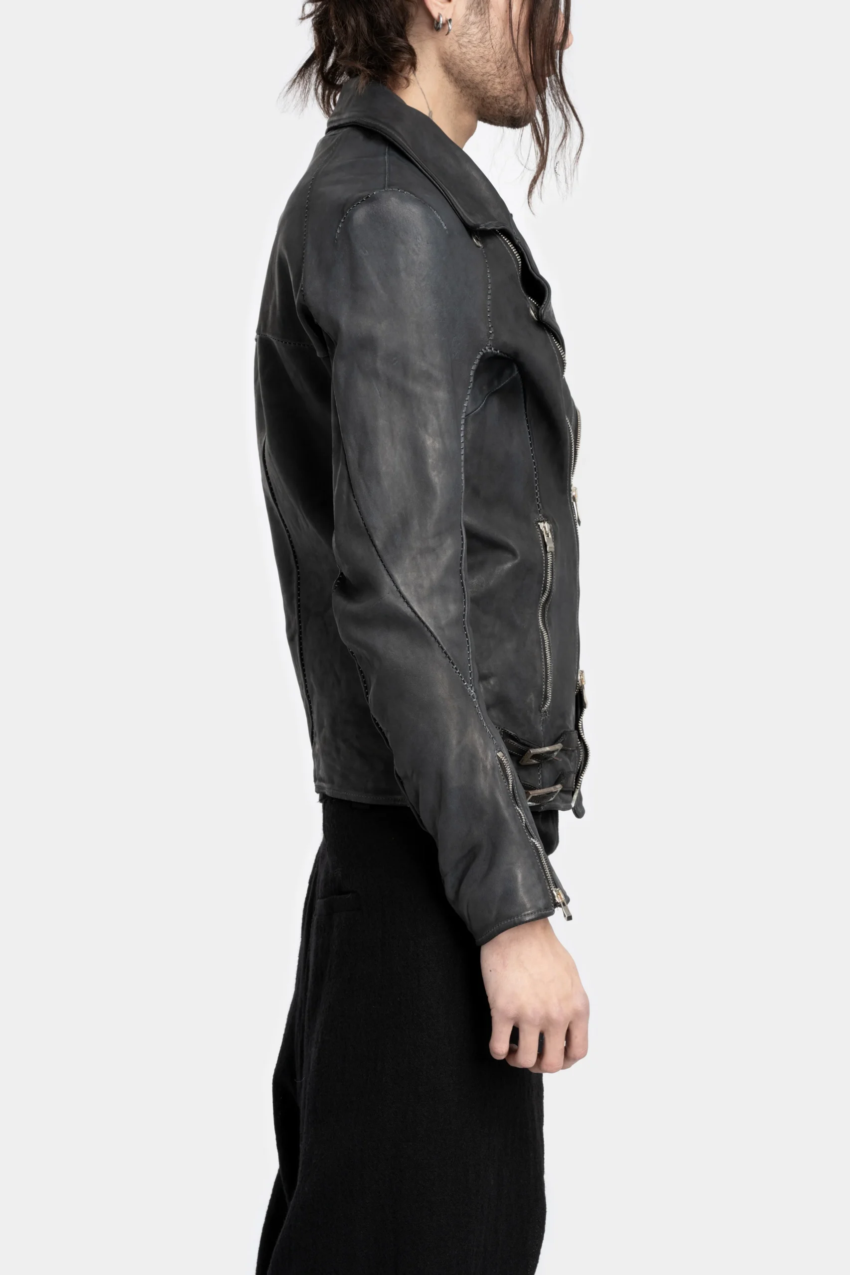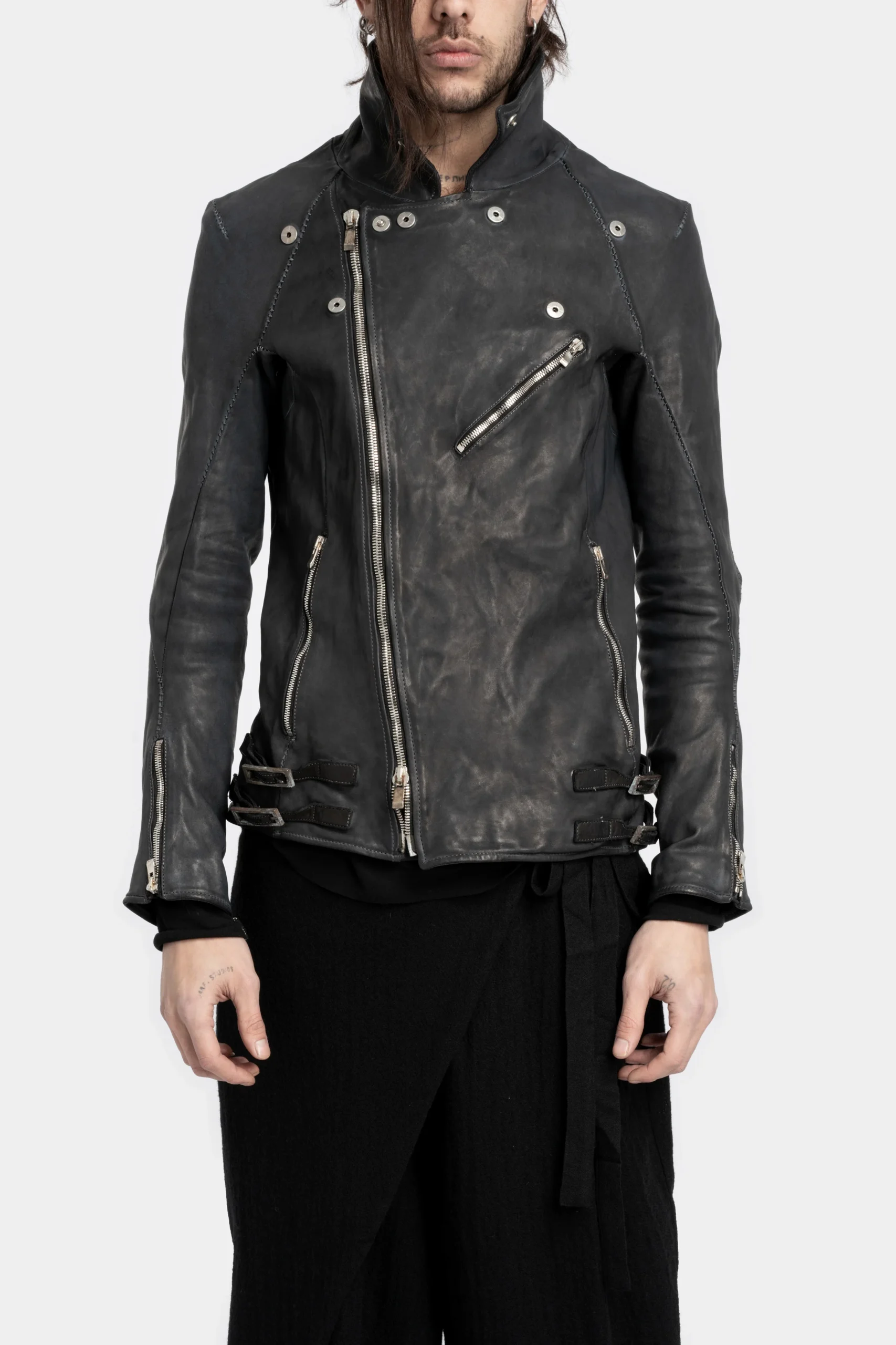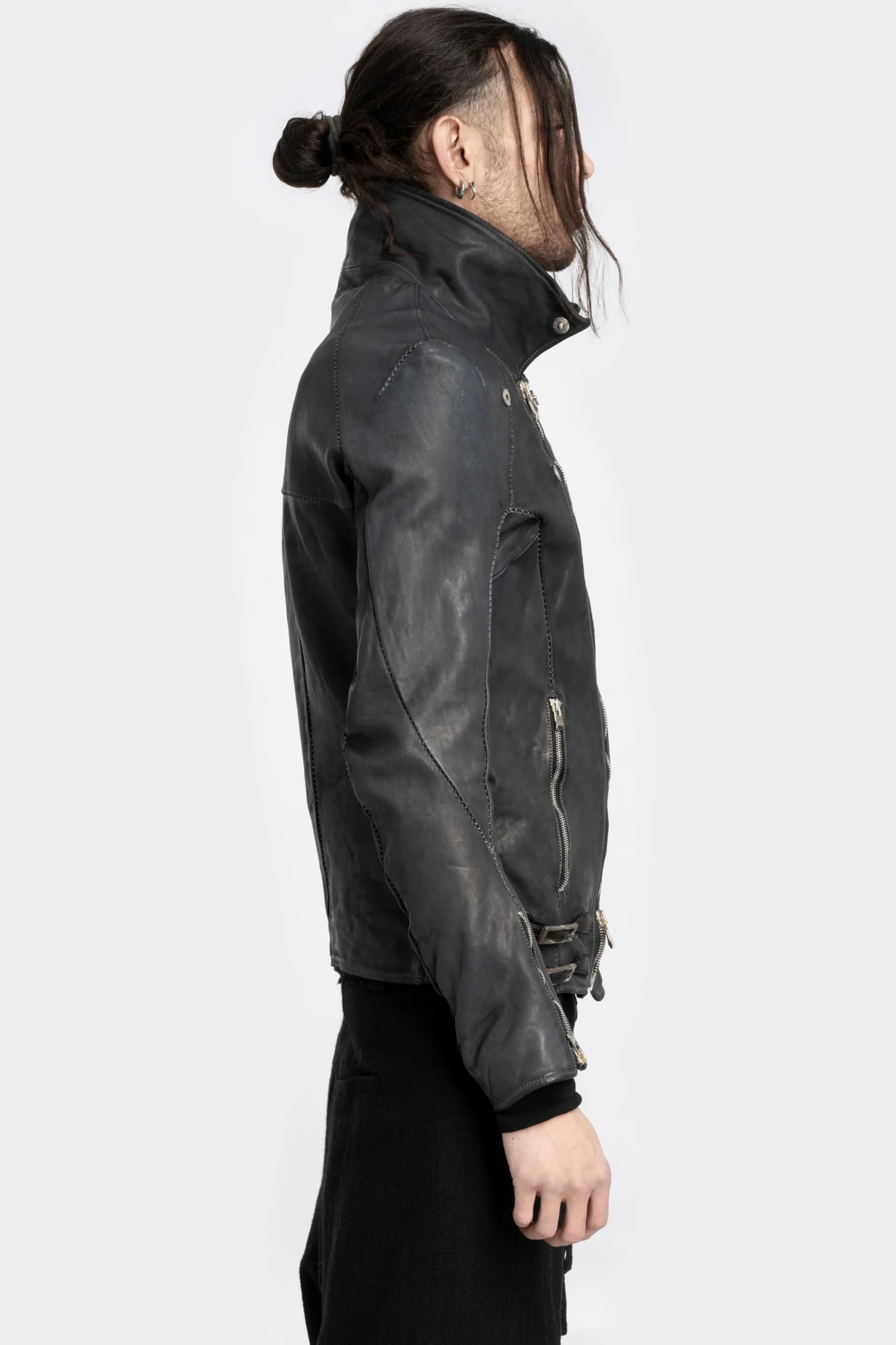 Men’s over-dyed black horse biker style leather jacket with midnight blue hues featuring multiple zippers and oxidised buttons and other metal hardware from Incarnation.