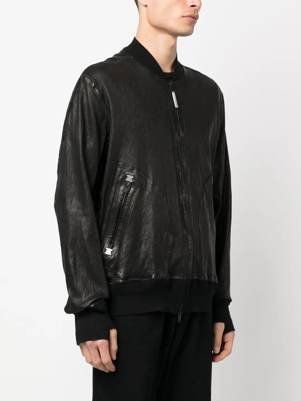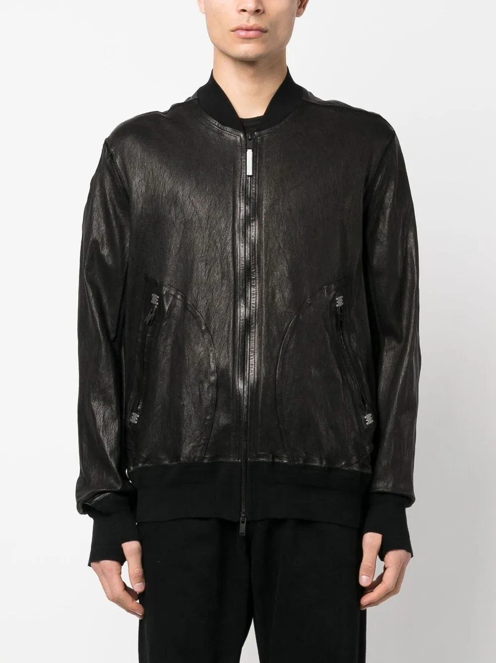 black lambskin crease effect two side zip-fastening pockets front zip fastening band collar long sleeves elasticated cuffs elasticated hem