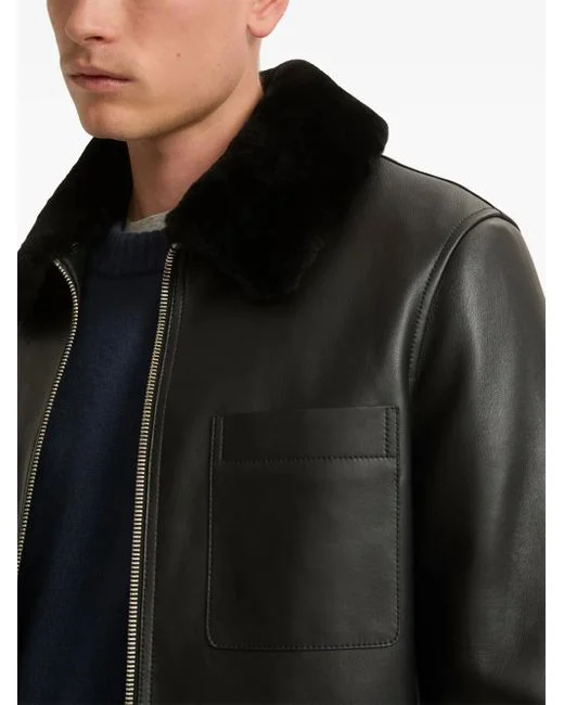 Black lambskin shearling collar front zip fastening chest patch pocket long sleeves straight hem full lining