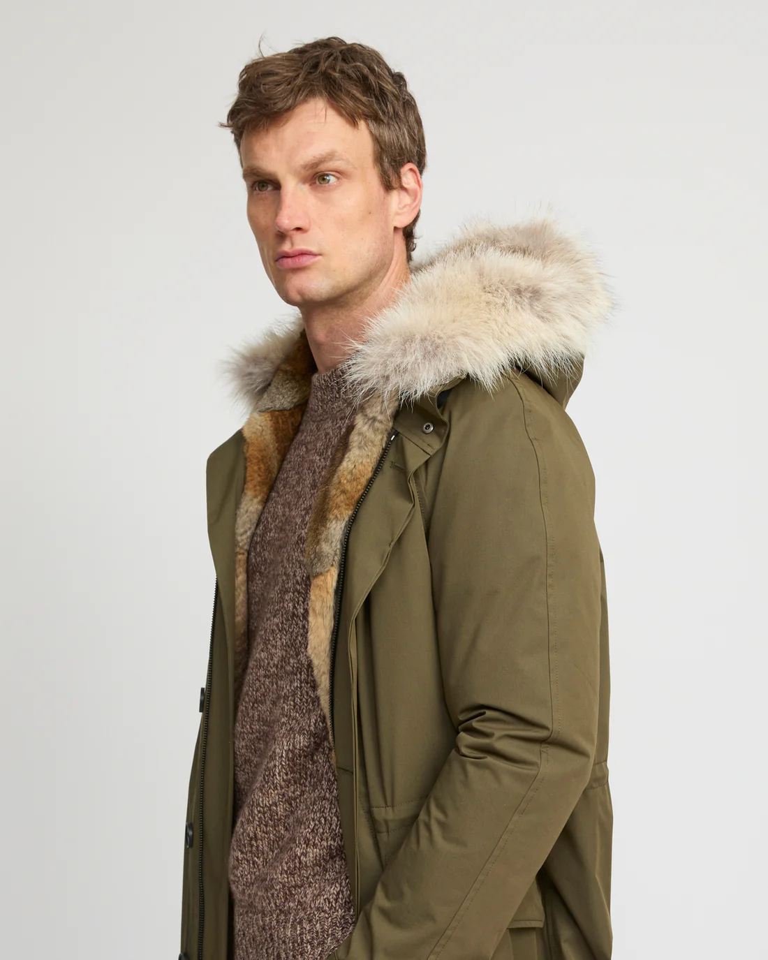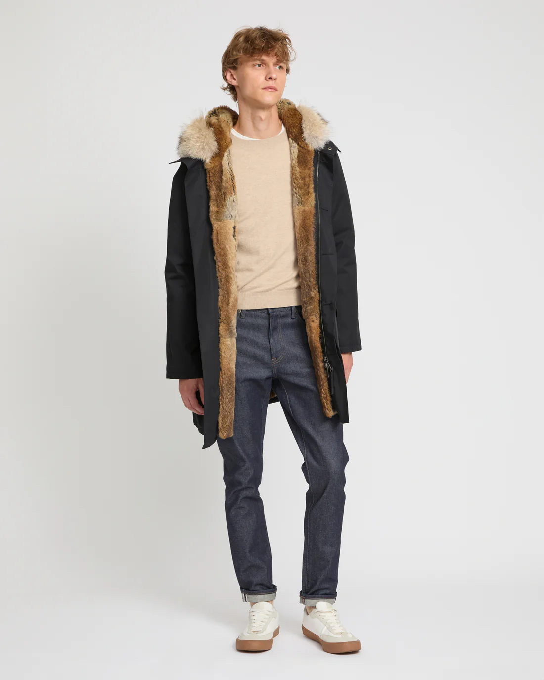 Winter’s perfect parka. Its weatherproof technical fabric hides a removable rabbit-fur lining, while the fox trim of the hood is also detachable. A drawstring at the waist allows the fit to be adjusted according to requirements, and a zip plus button fastening provides double protection against cold air.