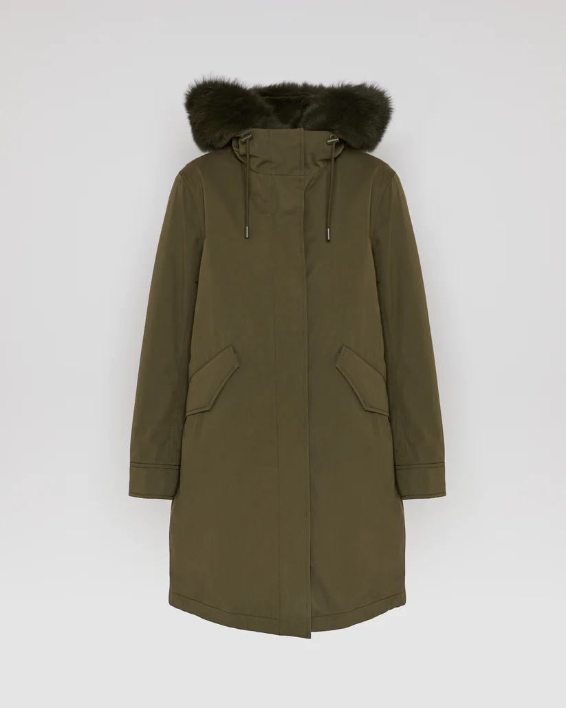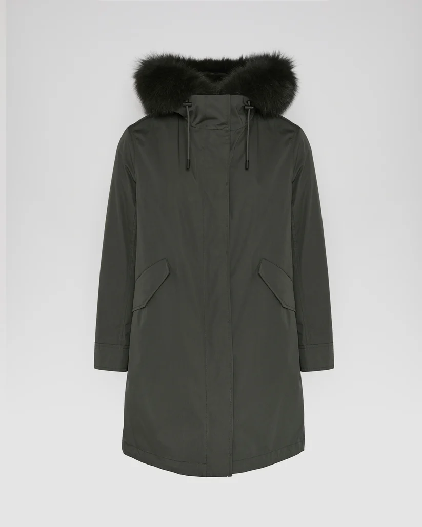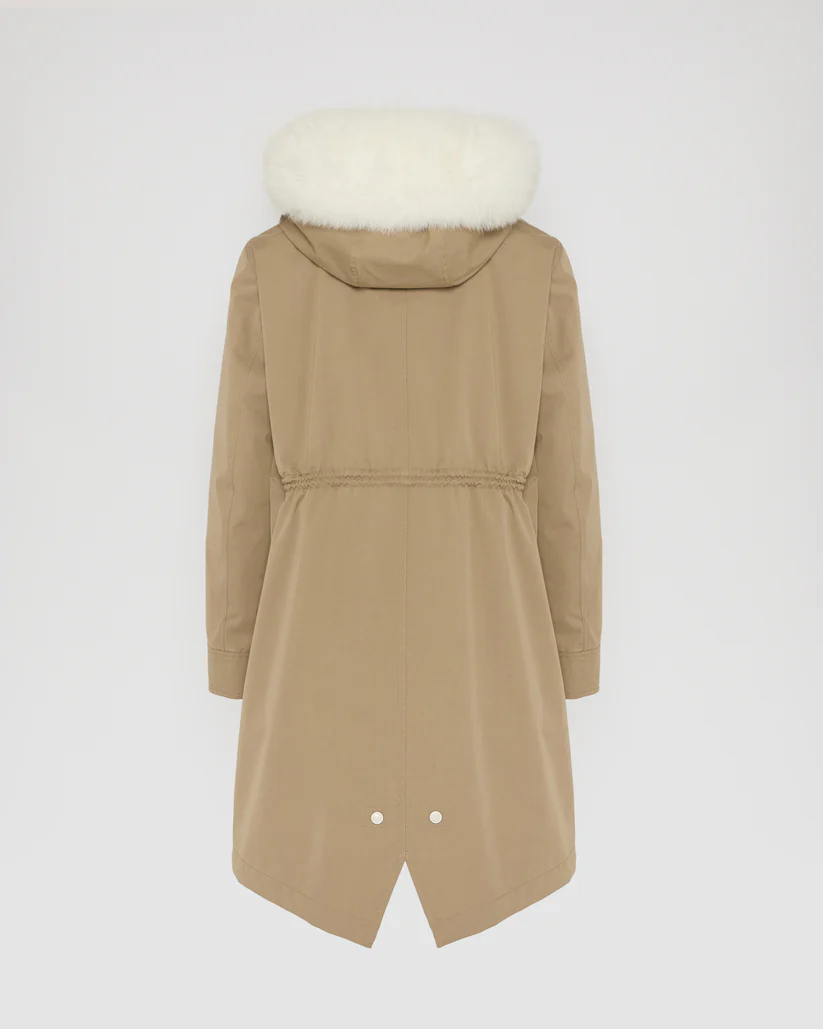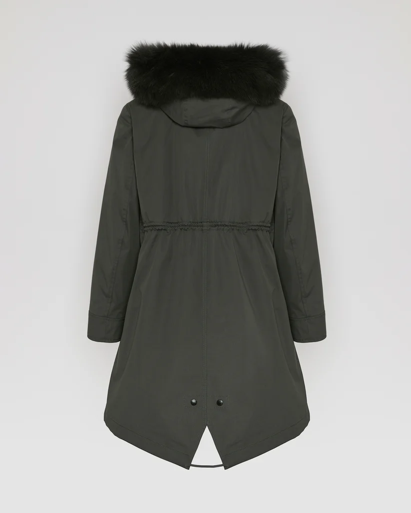 Crafted from a weather-resistant cotton blend, this regular parka has a flared cut and a pared back silhouette. Design details include a concealed zip and button fastening, two flap pockets, an inside pocket and a fishtail finish in the back. Drawstrings at the waist and bottom allow the fit to be adjusted for a more feminine and contemporary look. Warm and enveloping, this model has a detachable hood trim in fox fur, as well as a removable lining in sheared rabbit featuring padded sleeves filled with high-quality feathers and down, as well as ribbed finishes. Functional and timeless, this parka is versatile to match the season.