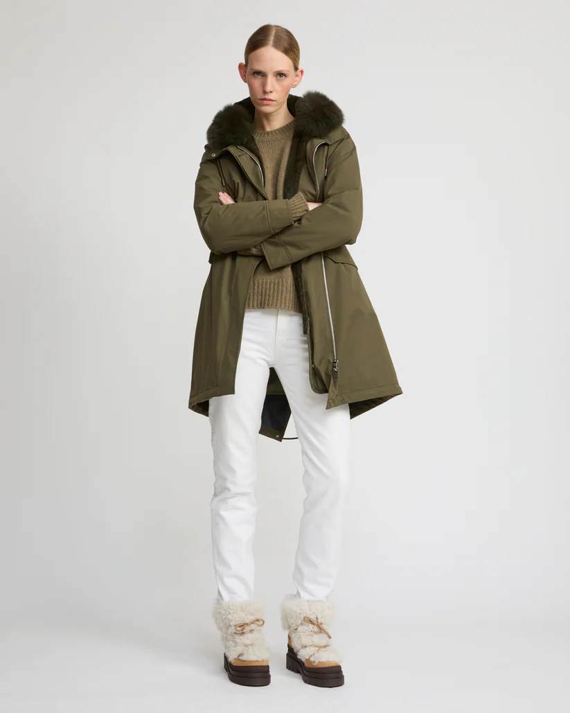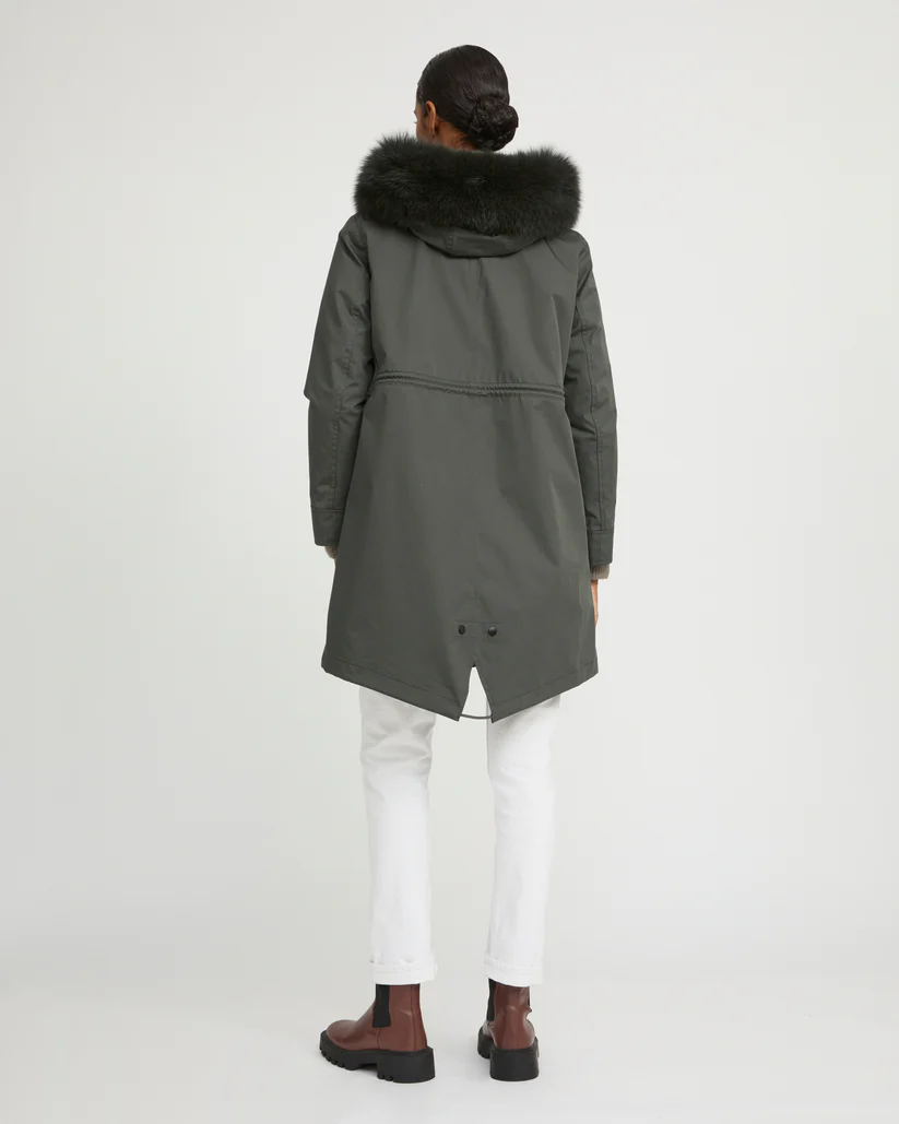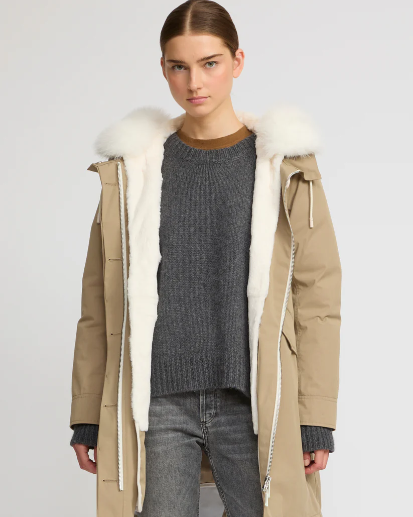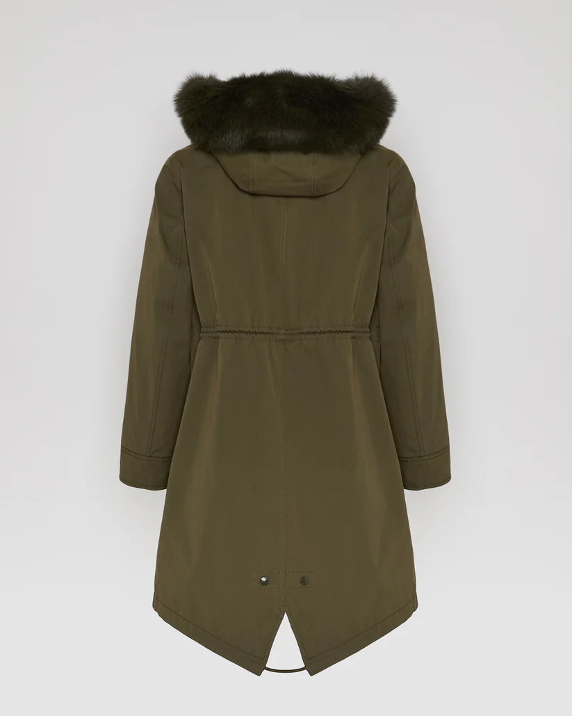 Crafted from a weather-resistant cotton blend, this regular parka has a flared cut and a pared back silhouette. Design details include a concealed zip and button fastening, two flap pockets, an inside pocket and a fishtail finish in the back. Drawstrings at the waist and bottom allow the fit to be adjusted for a more feminine and contemporary look. Warm and enveloping, this model has a detachable hood trim in fox fur, as well as a removable lining in sheared rabbit featuring padded sleeves filled with high-quality feathers and down, as well as ribbed finishes. Functional and timeless, this parka is versatile to match the season.