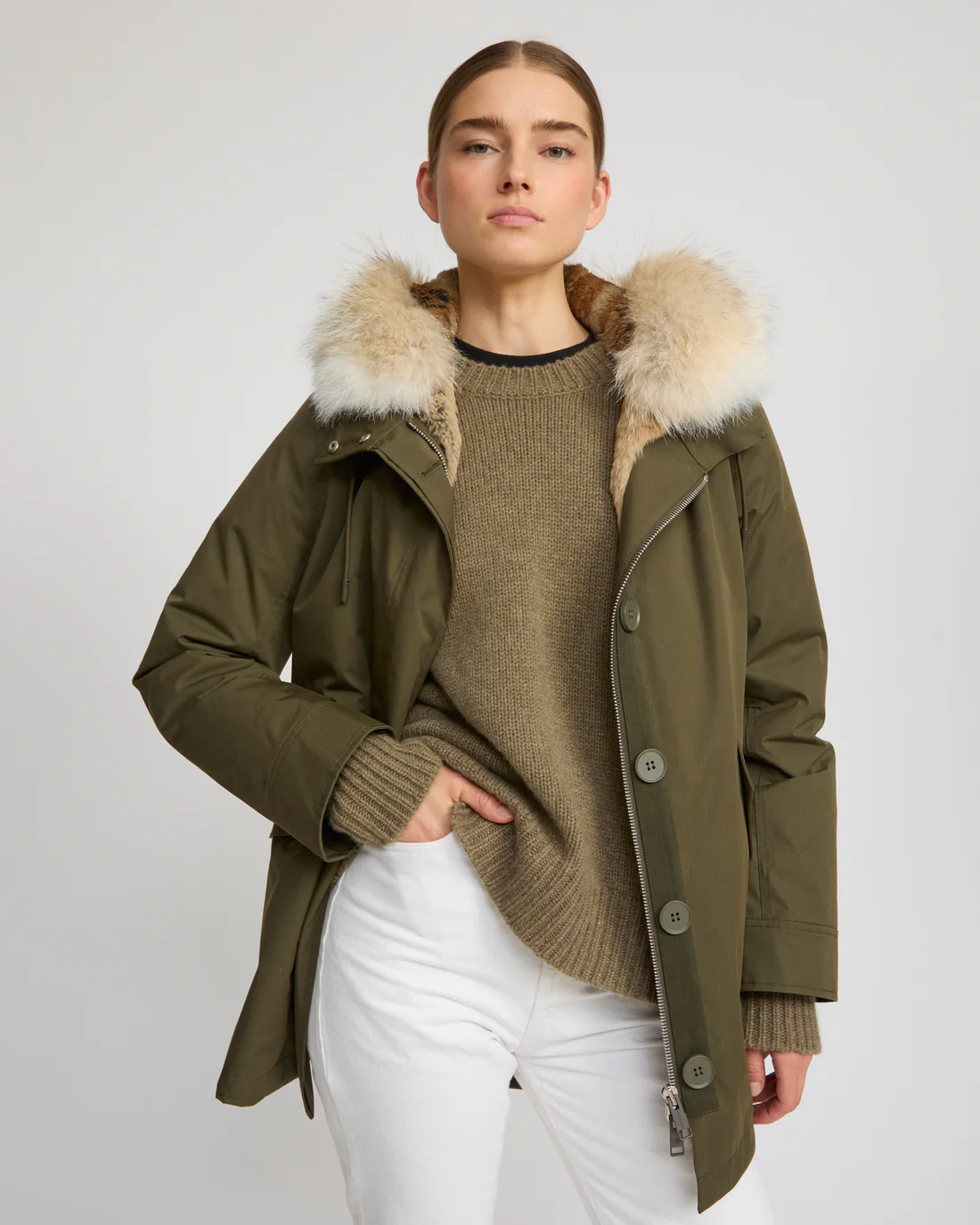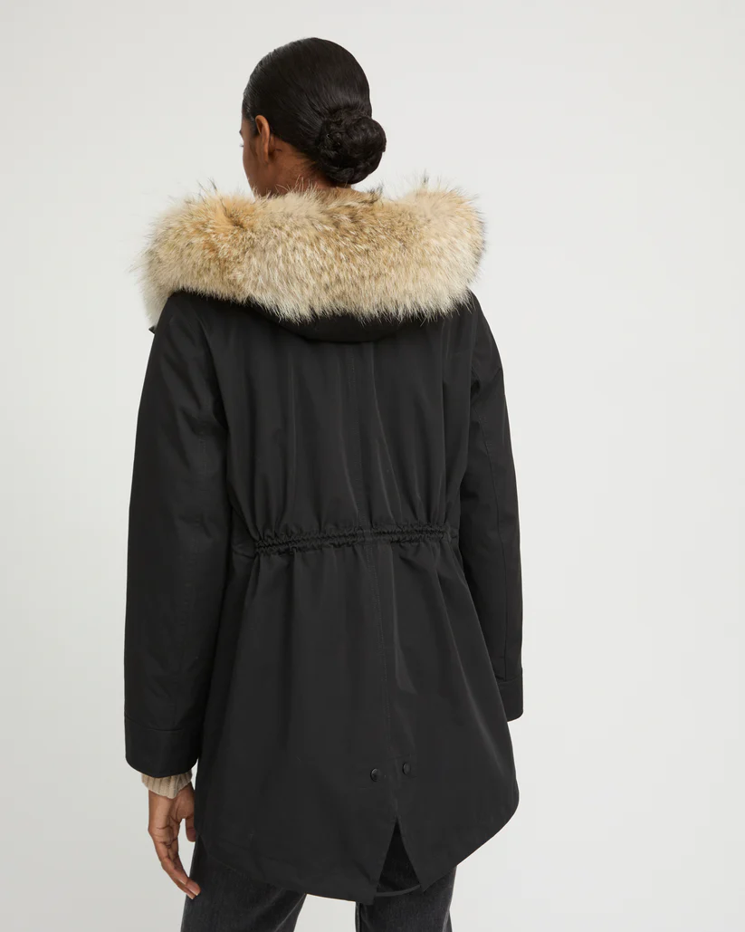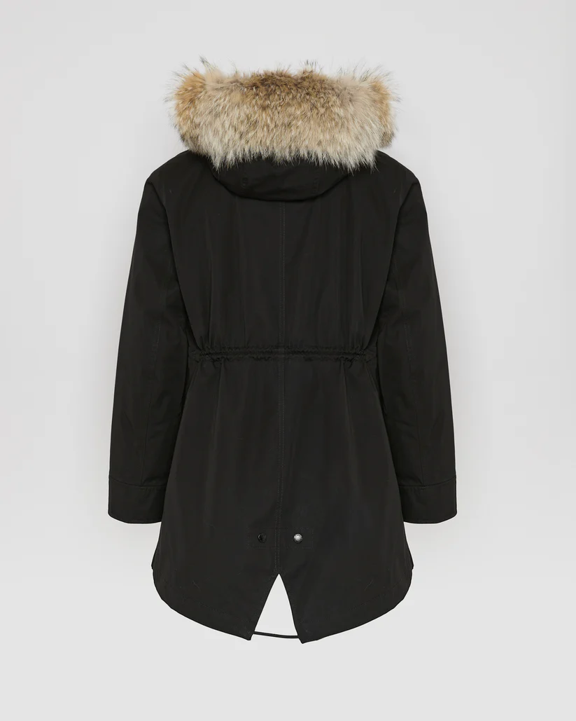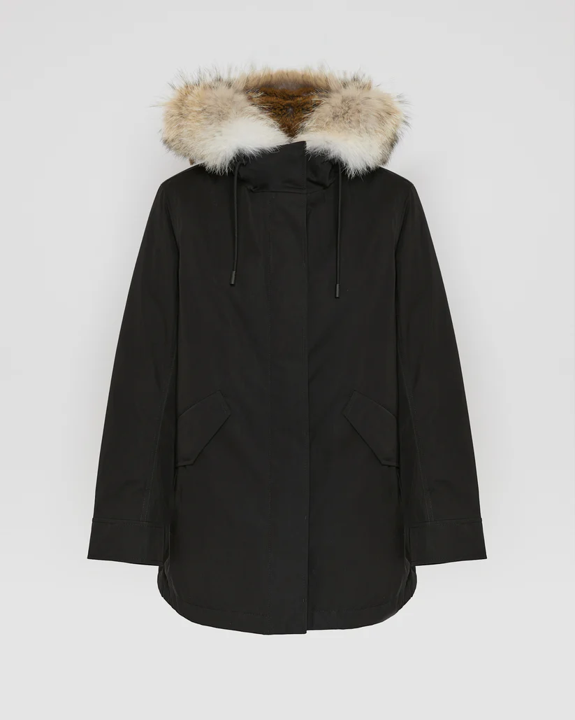 A short parka which plays on textures, with a technical fabric and rex rabbit and coyote fur providing softness and warmth to this zipped, hooded design with flap pockets.