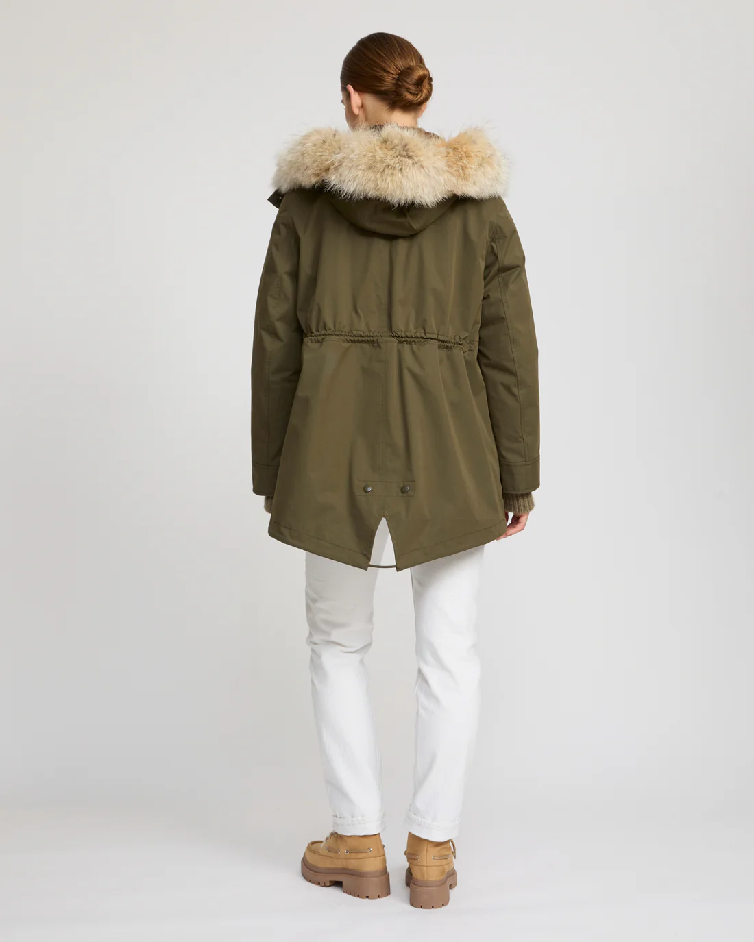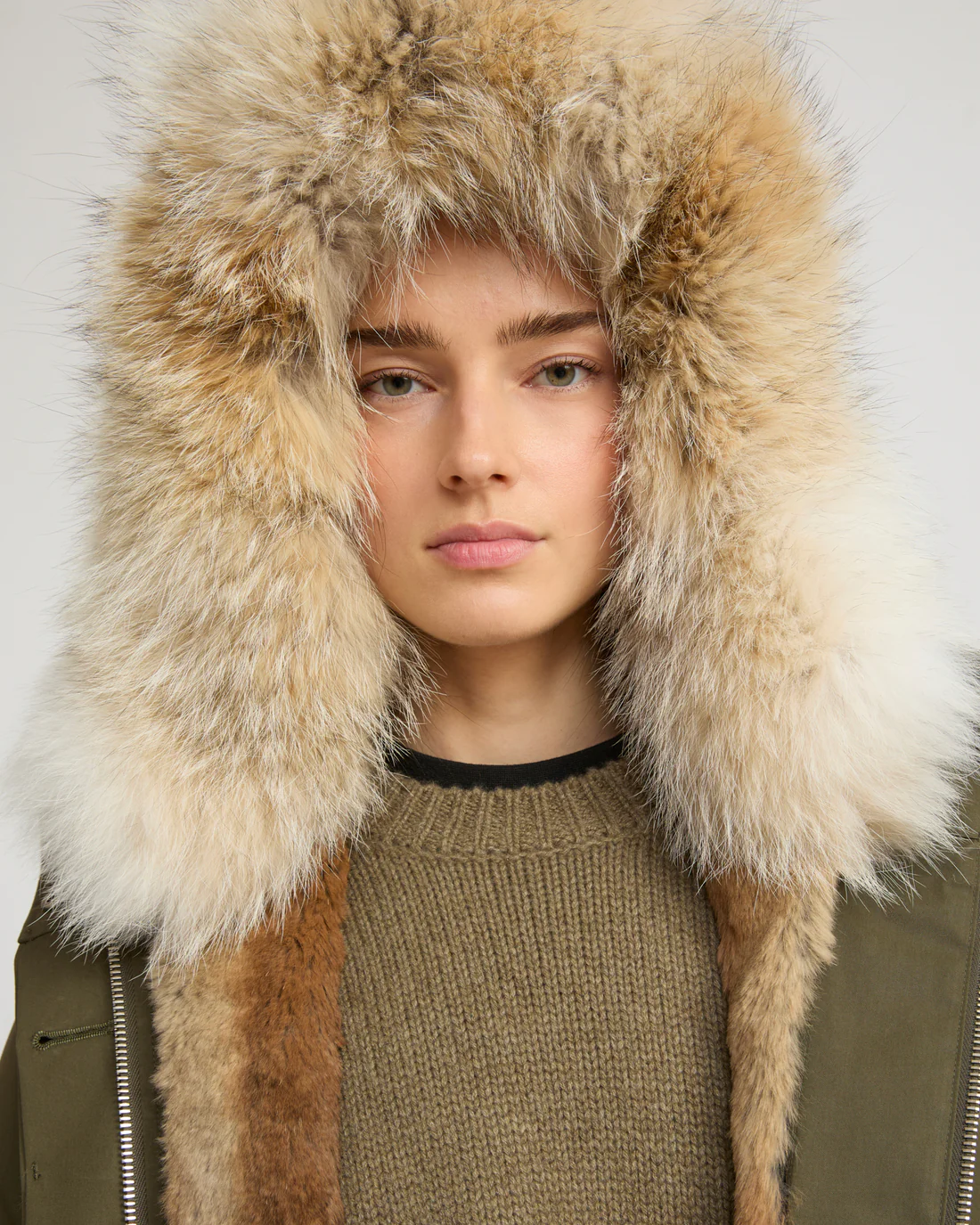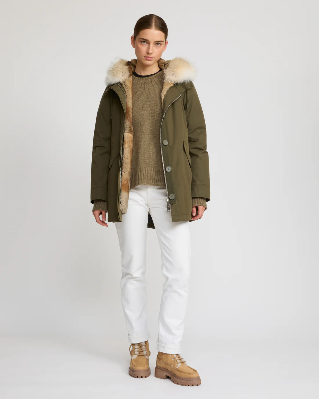 A short parka which plays on textures, with a technical fabric and rex rabbit and coyote fur providing softness and warmth to this zipped, hooded design with flap pockets.